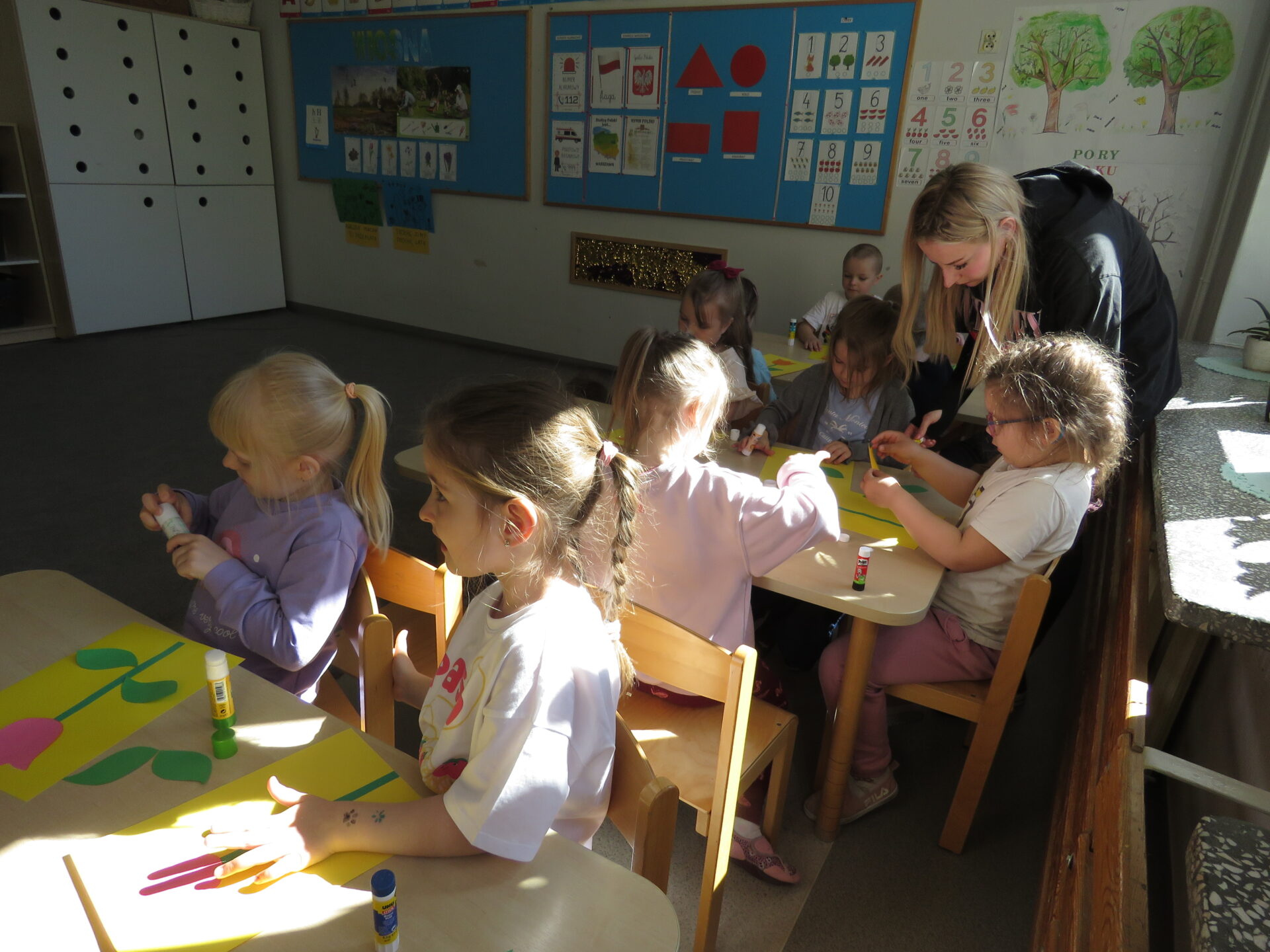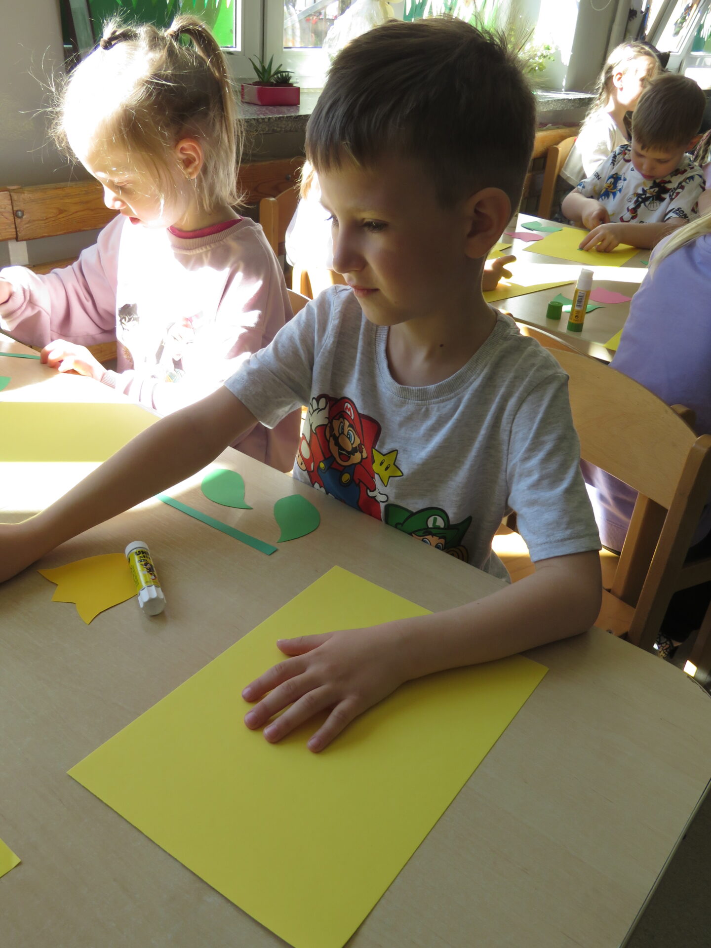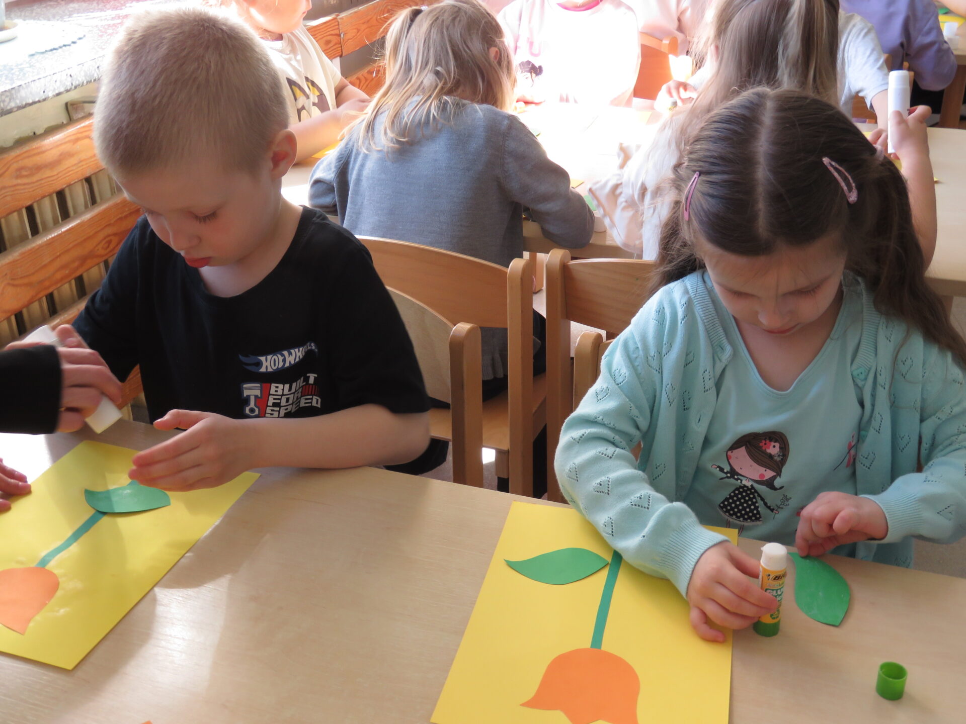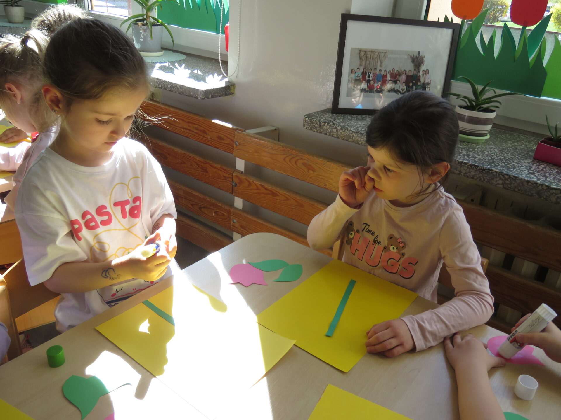Później dzieci wykonały pracę plastyczną” Mój wiosenny kwiat”. Dzieci przy stolikach z przygotowanych materiałów plastycznych i według instrukcji nauczyciela utworzyły kwiatka: najpierw przyklejały łodygę, potem płatki, a na końcu liście. W tle grała spokojna muzyka.
