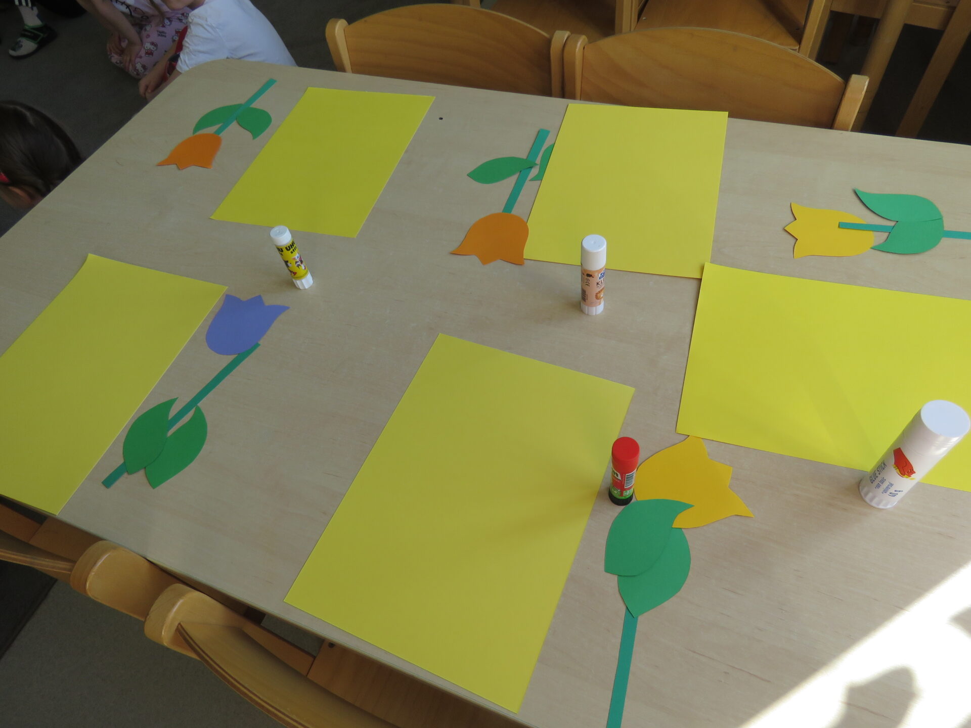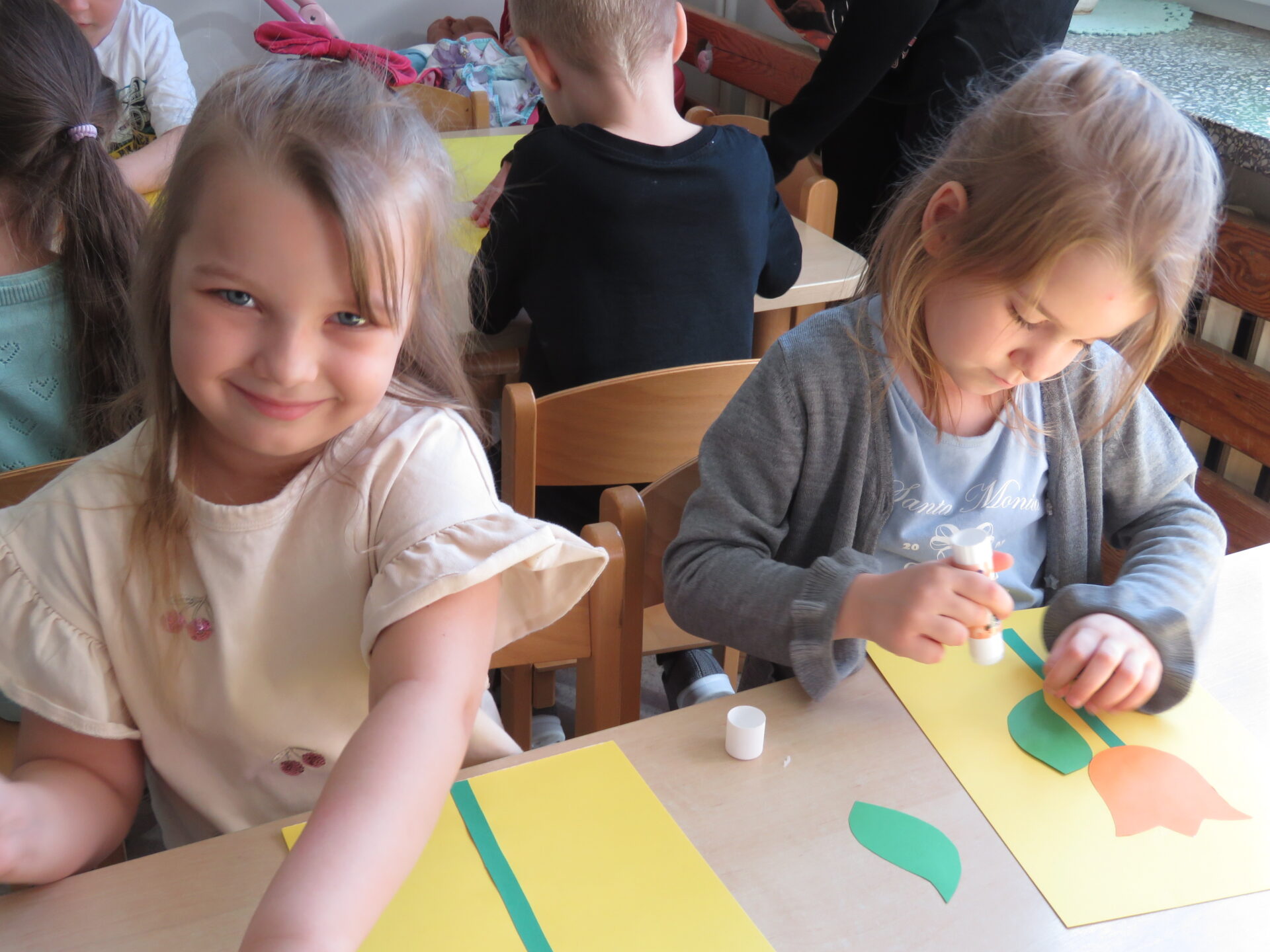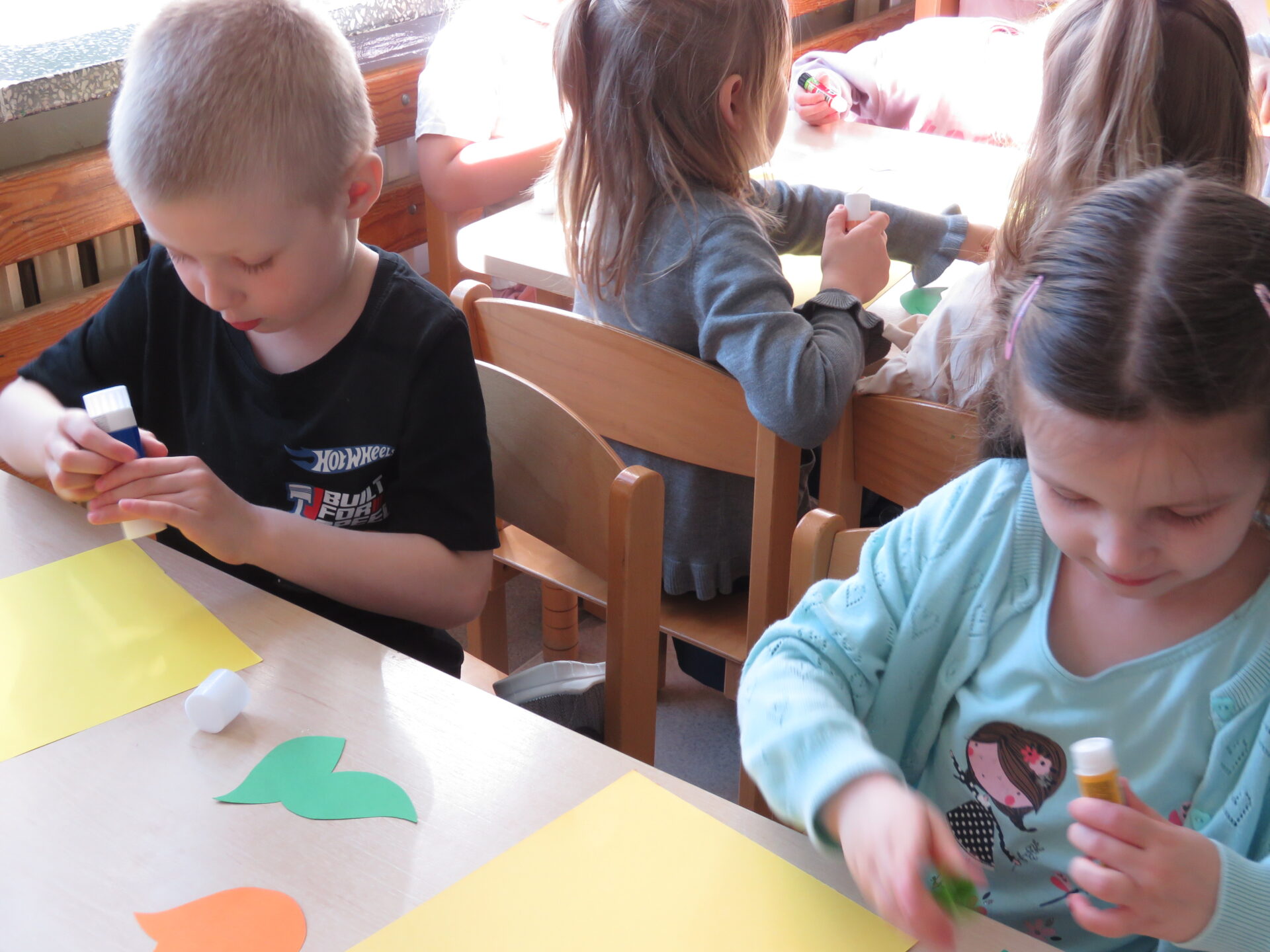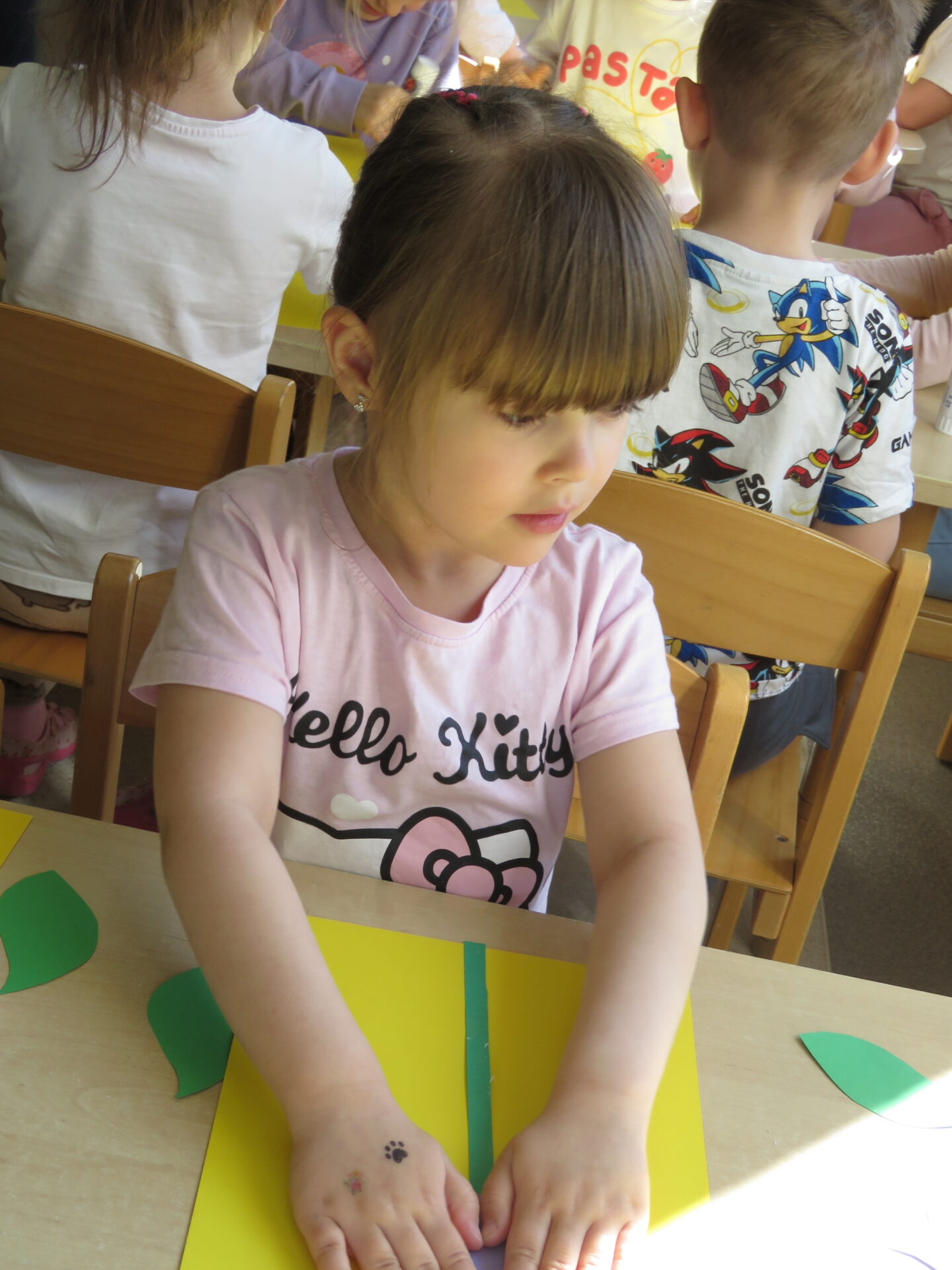 Później dzieci wykonały pracę plastyczną” Mój wiosenny kwiat”. Dzieci przy stolikach z przygotowanych materiałów plastycznych i według instrukcji nauczyciela utworzyły kwiatka: najpierw przyklejały łodygę, potem płatki, a na końcu liście. W tle grała spokojna muzyka.