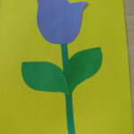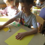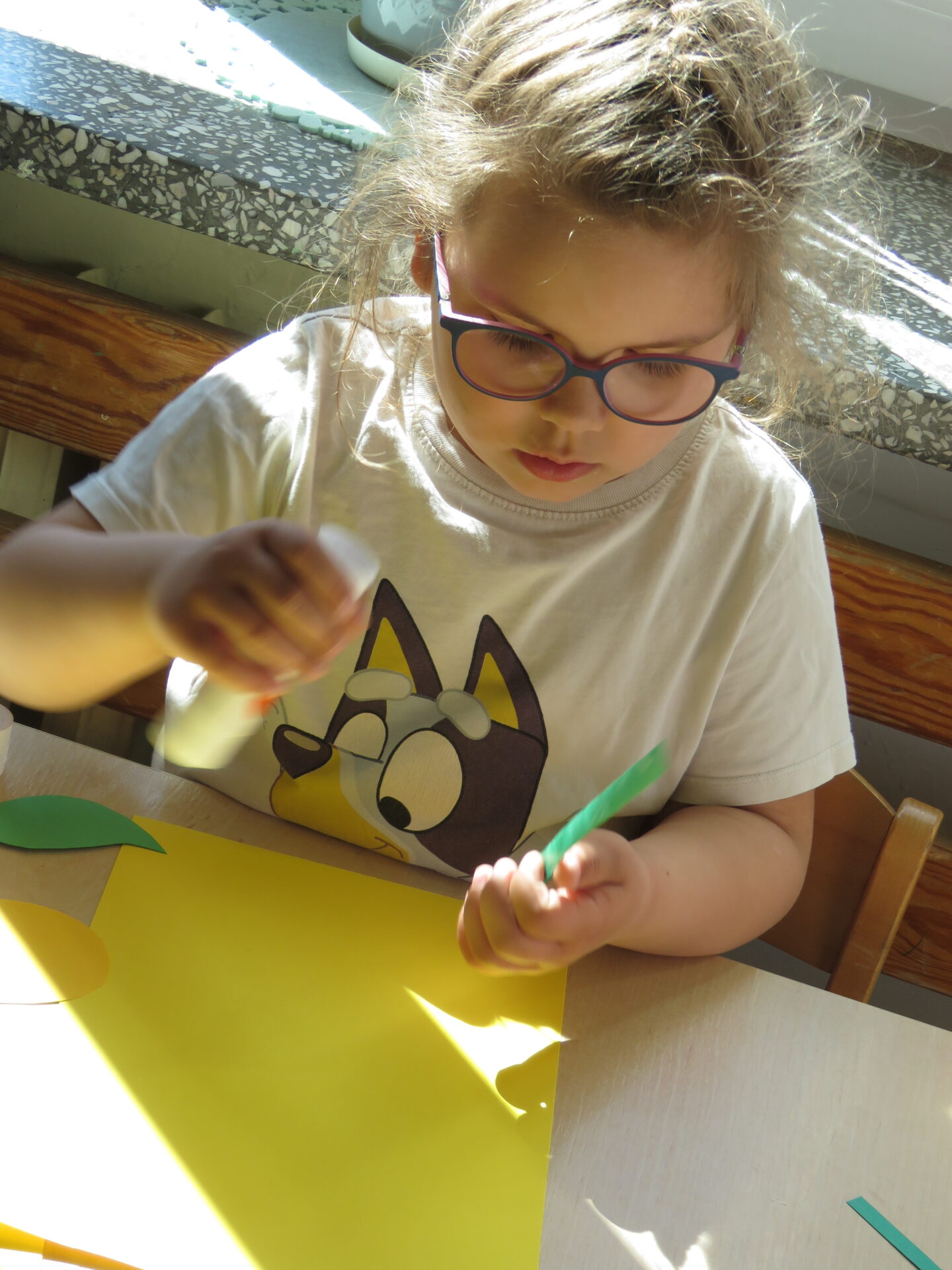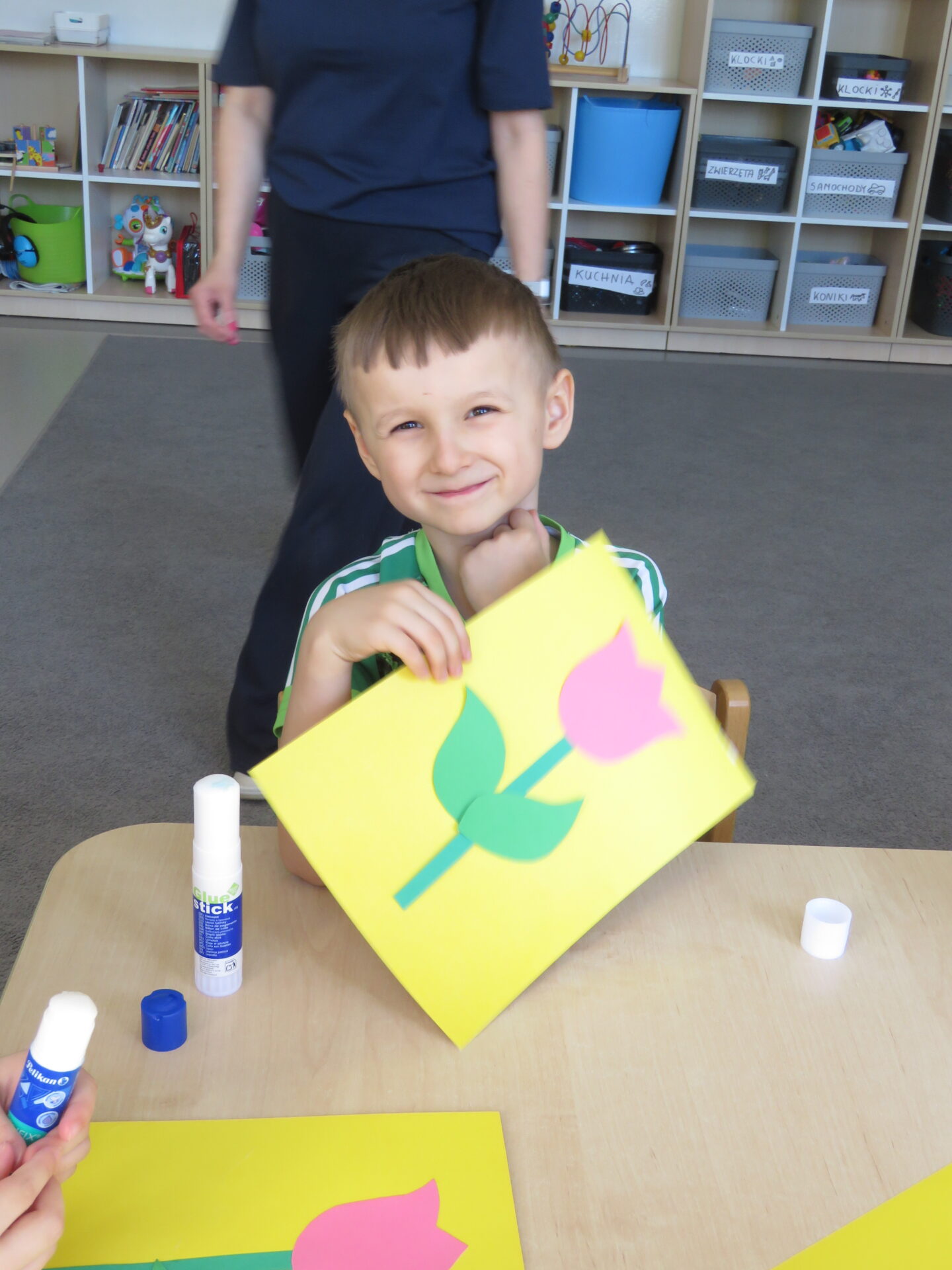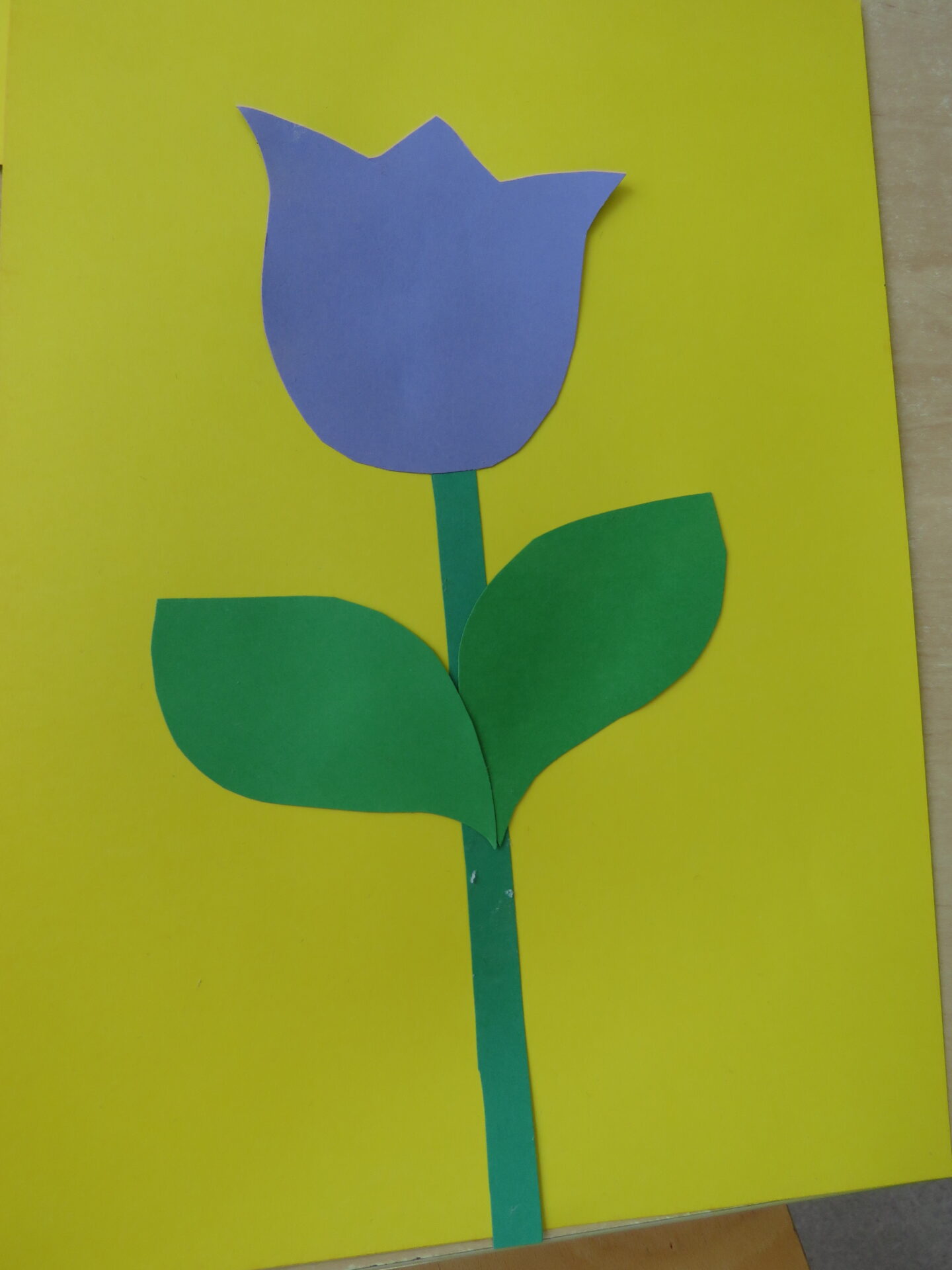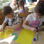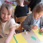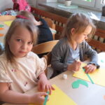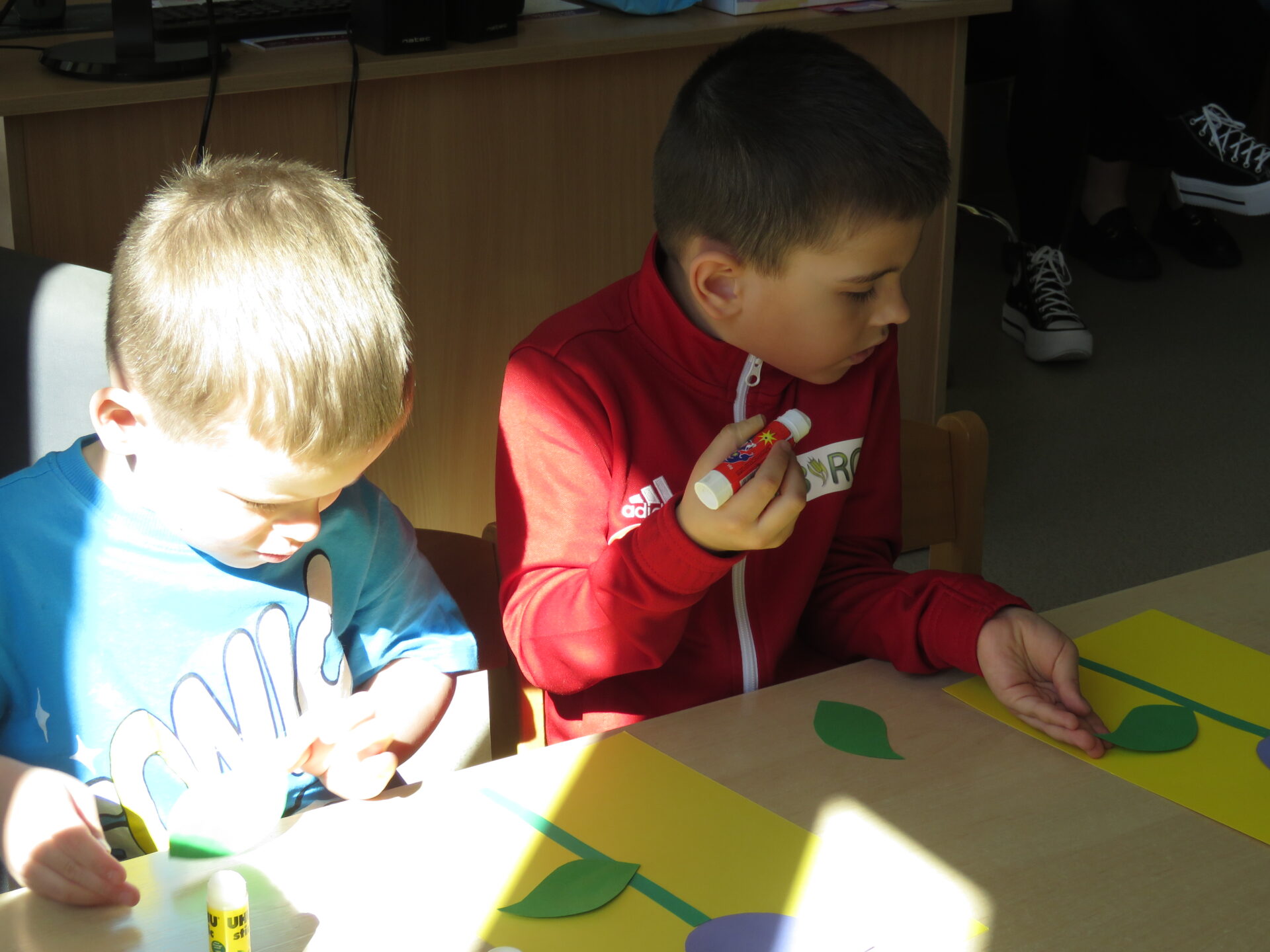 Później dzieci wykonały pracę plastyczną” Mój wiosenny kwiat”. Dzieci przy stolikach z przygotowanych materiałów plastycznych i według instrukcji nauczyciela utworzyły kwiatka: najpierw przyklejały łodygę, potem płatki, a na końcu liście. W tle grała spokojna muzyka.
