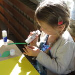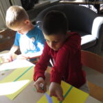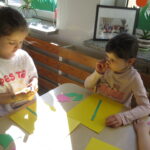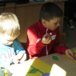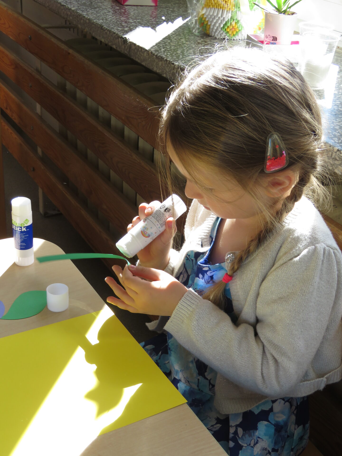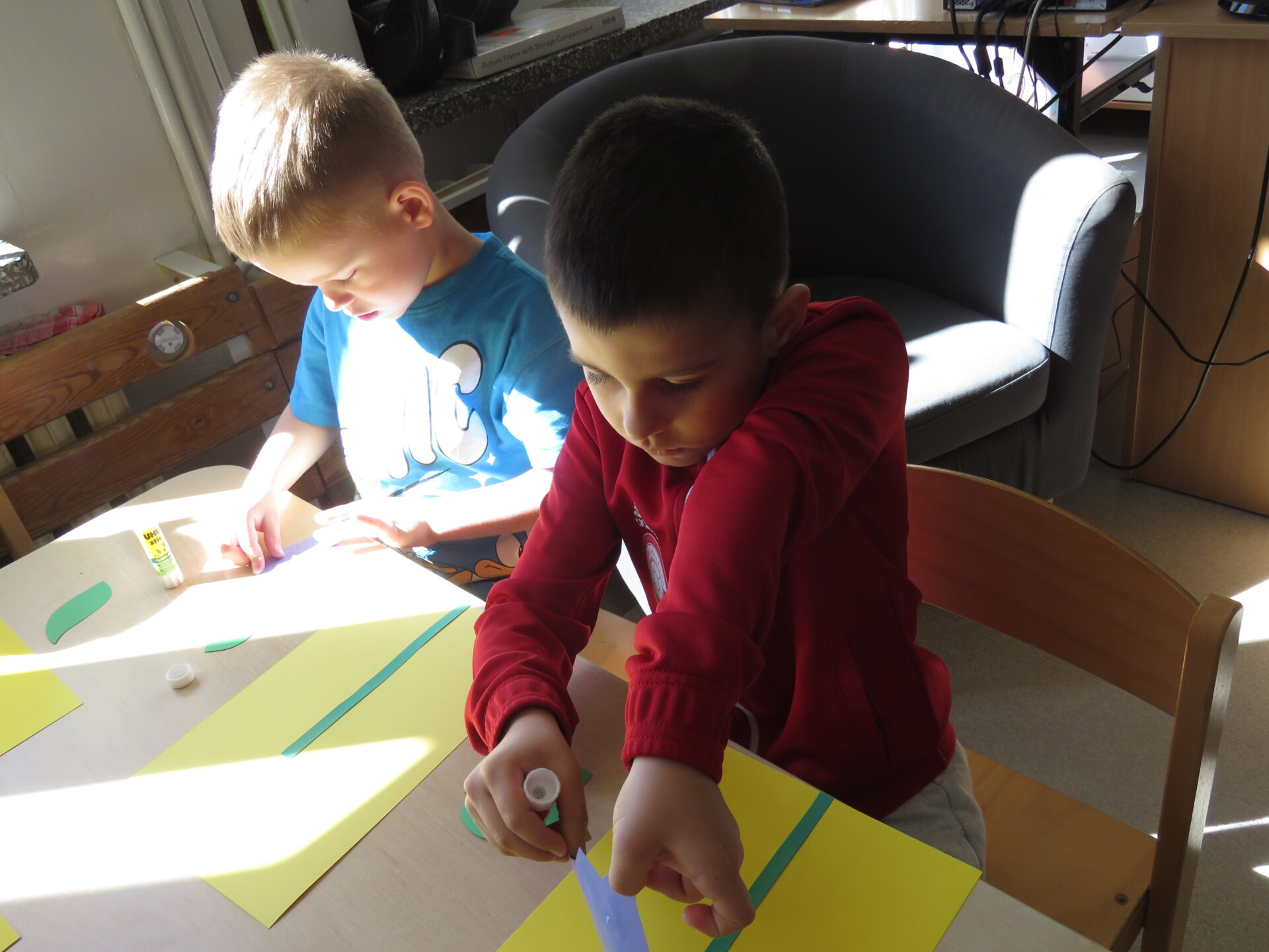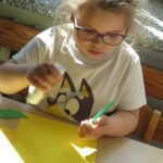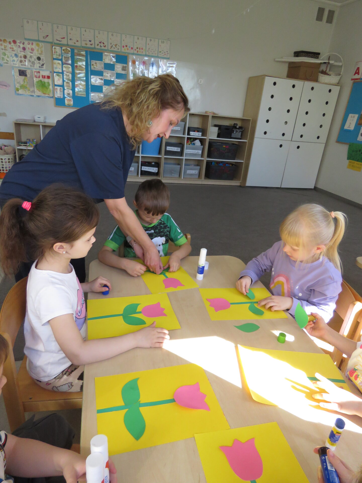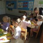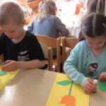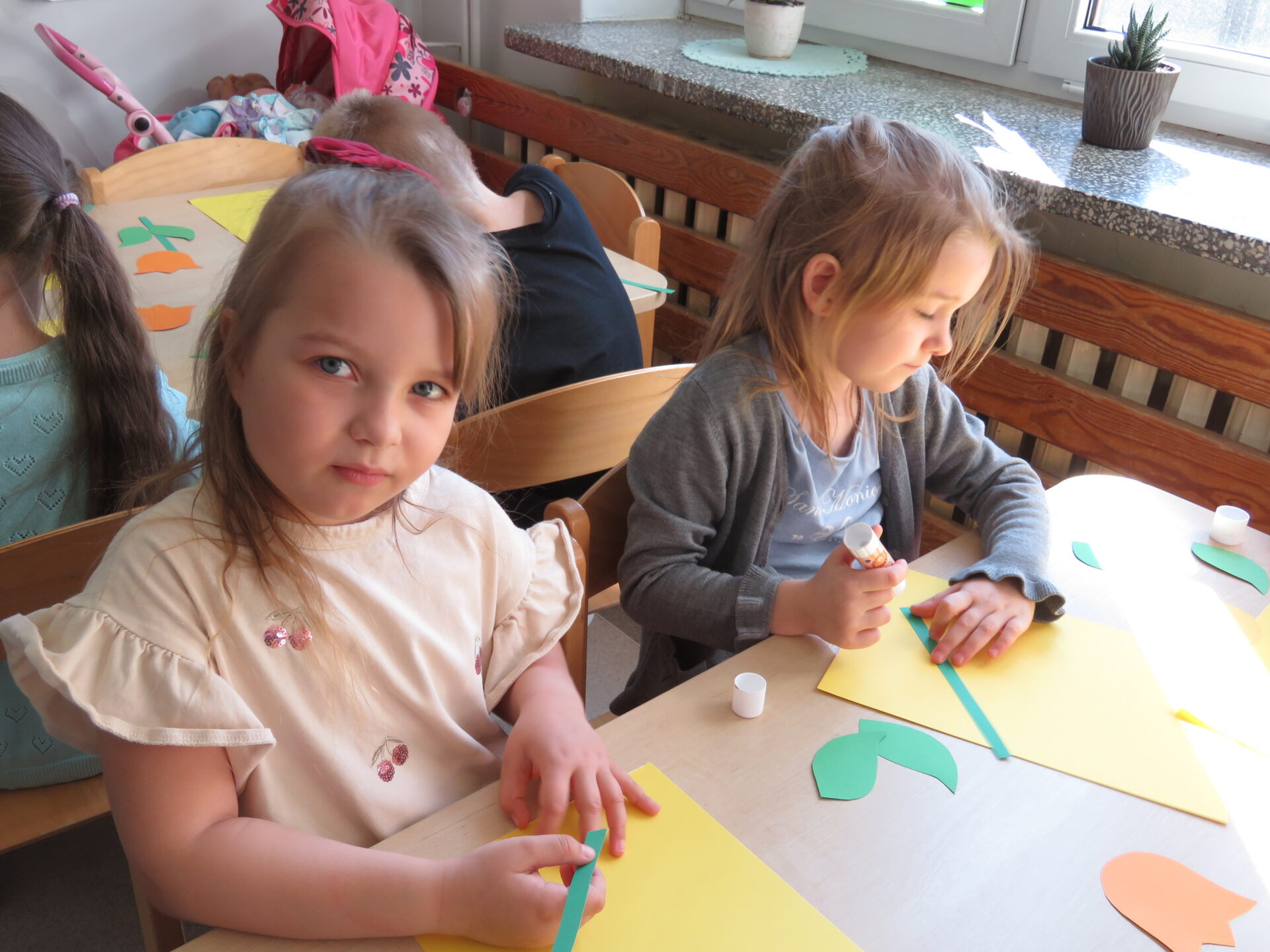 Później dzieci wykonały pracę plastyczną” Mój wiosenny kwiat”. Dzieci przy stolikach z przygotowanych materiałów plastycznych i według instrukcji nauczyciela utworzyły kwiatka: najpierw przyklejały łodygę, potem płatki, a na końcu liście. W tle grała spokojna muzyka.