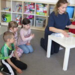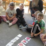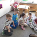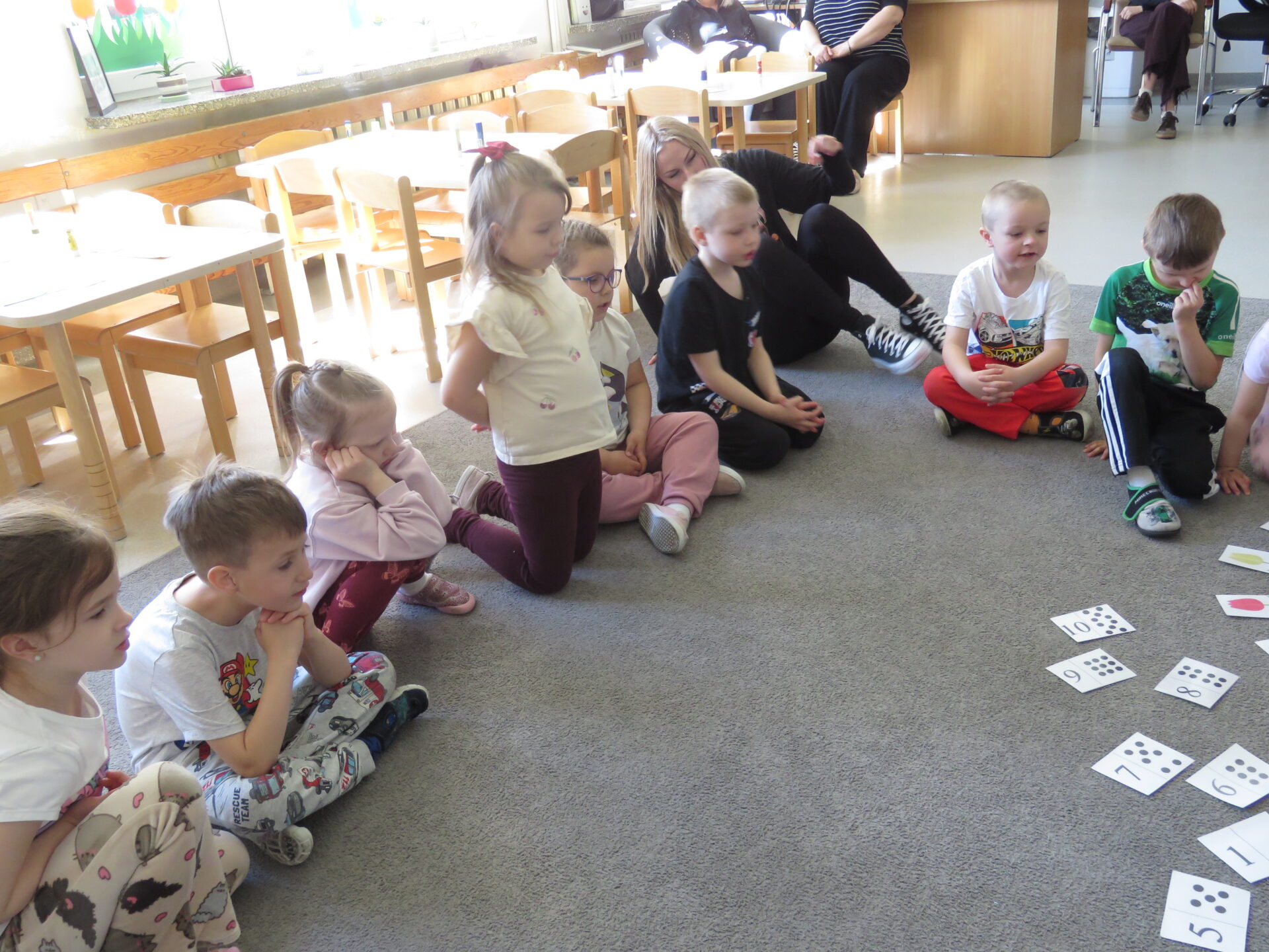Potem prowadząca za pomocą rymowanki przeszła do zadania matematycznego: ” Na łące coś się wydarzyło, dużo kwiatów się zjawiło! Fiołeczki, policzymy je dokładnie, czy zrobimy to poprawnie…