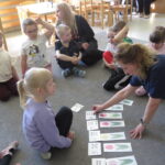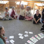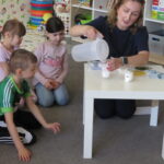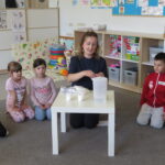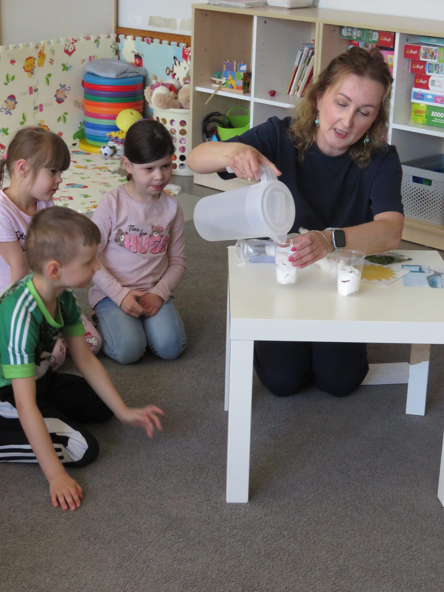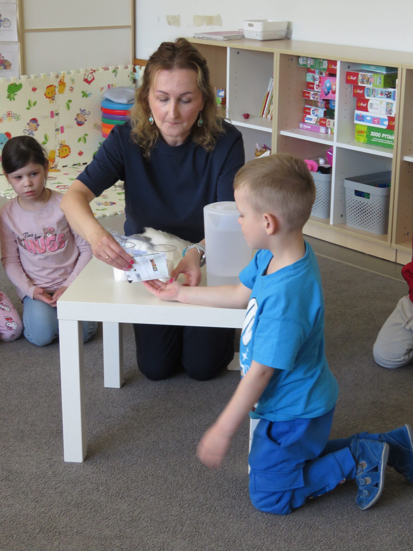 Później Pani Kamila zaprosiła dzieci do mini eksperymentu „Czego potrzebuje roślina?” Nauczycielka rozłożyła na dywanie dwa obrazki przedstawiające: słońce, wodę, 2 kubeczki z watą, nasiona – rzeżuchy, wodę w małym dzbanku i zadała pytanie: jak myślicie, co jest potrzebne roślinom, żeby rosły? Po uzyskaniu odpowiedzi, zaproponowała mały, prosty eksperyment z rzeżuchą: