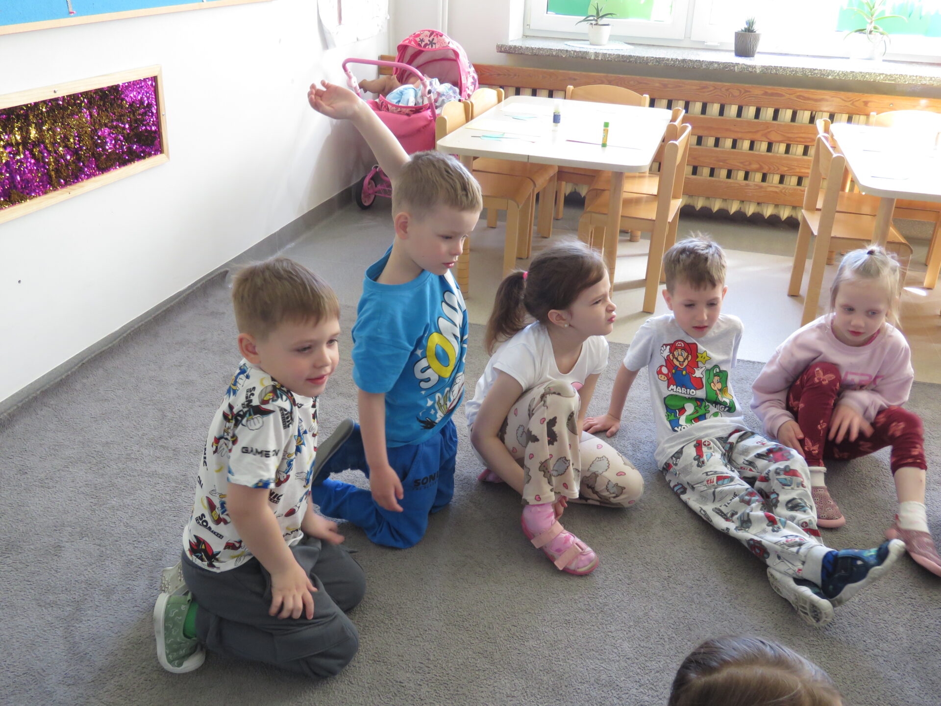 Dzieci wymieniły charakterystyczne cechy wiosny z pomocą kolorowych obrazków, odpowiadały na pytania : Po czym poznajemy, że jest wiosna? Co się zmienia po zimie? Przedszkolaki chętnie wzięły udział w zabawie ruchowej „Budzimy się jak zwierzęta”.