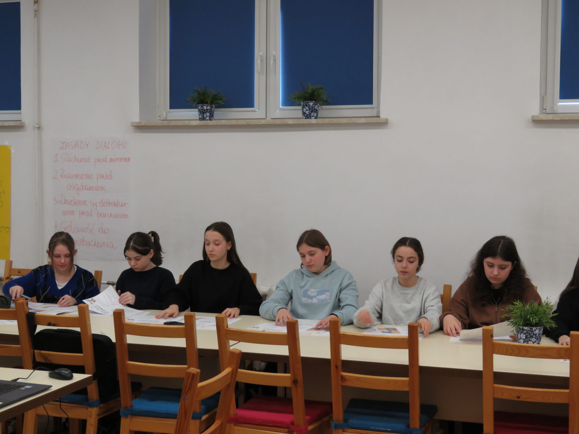 W tym roku szkolnym zaprosiliśmy naszą młodzież do uczestnictwa w tutoringu rówieśniczym. Przyszli młodzieżowi tutorzy uczestniczyli w kilku warsztatach prowadzonych przez przeszkolonych, doświadczonych tutorów. Jako pierwszy odbył się warsztat integracyjno – informacyjny podczas którego młodzież spisała kontrakt, rozważała kim jest i kim może być mistrz, poznała receptę na życie Steve’a Jobsa. Odpowiadała na pytanie – Jaki powinien być mistrz?, Co to jest tutoring młodzieżowy?
