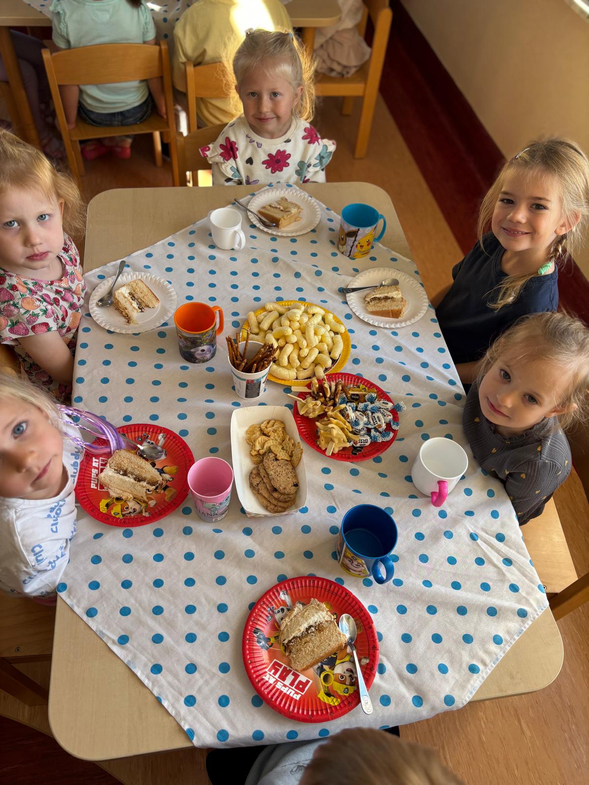 Dzień spędziliśmy wesoło, nie zabrakło zabaw przy muzyce, podczas których dzieci pokazały swoje talenty taneczne. Każdy z solenizantów otrzymał upominek, kolorowy balonik oraz pamiątkowy dyplom. Na dzieci czekał również poczęstunek, który wszystkim bardzo smakował.