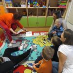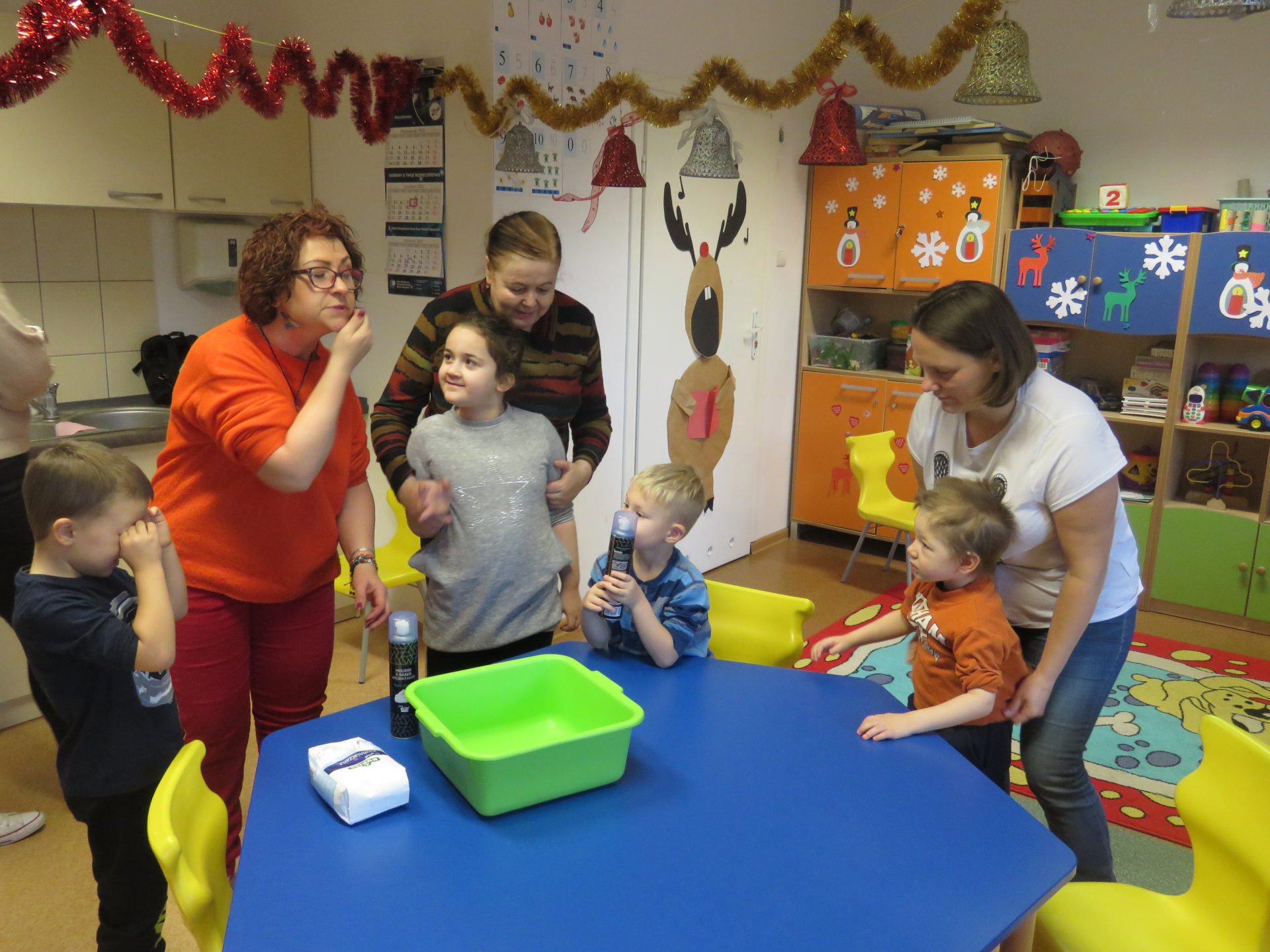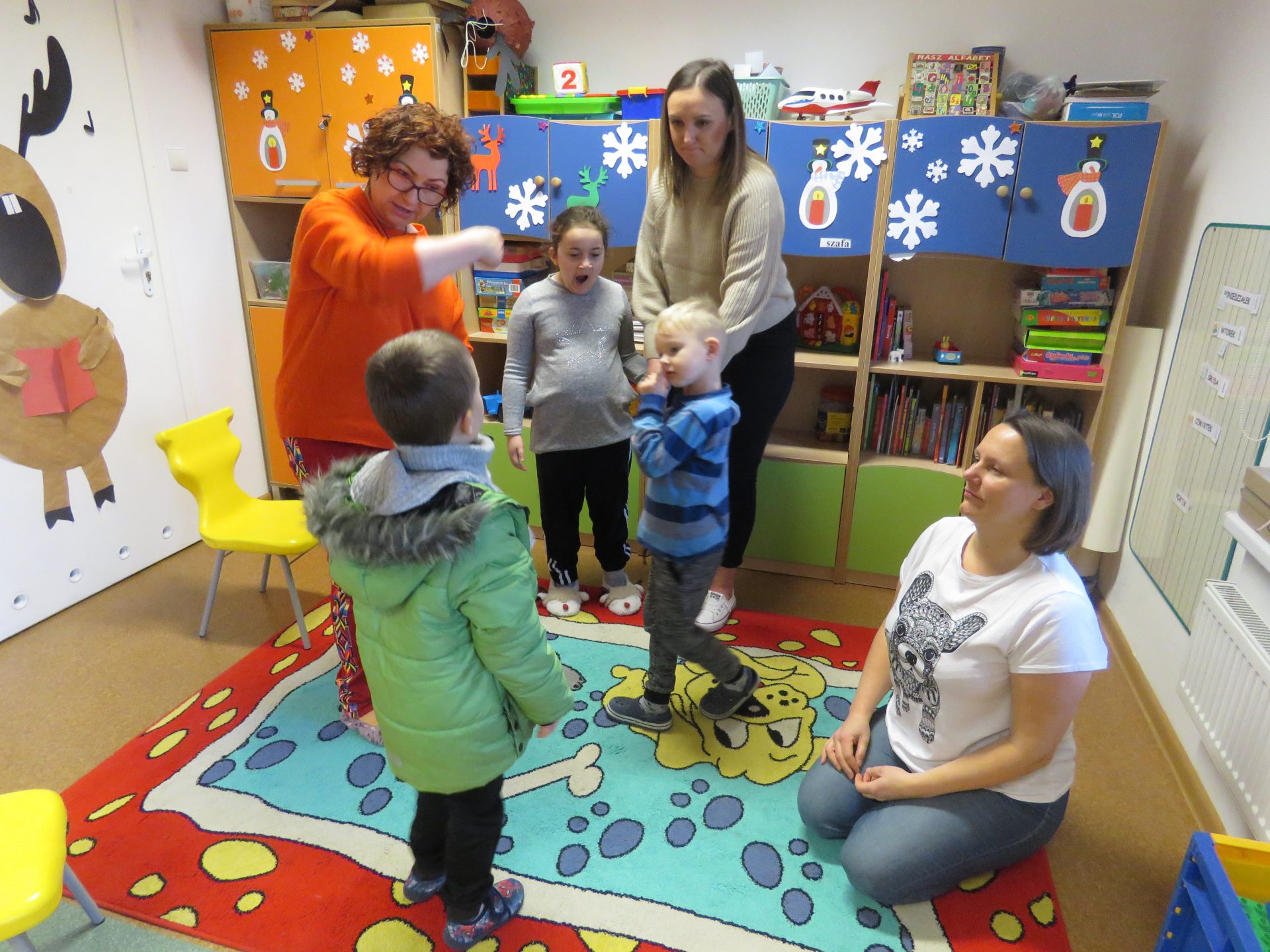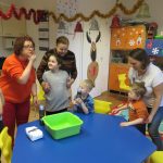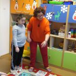 - Zabawa muzyczno-ruchowa „Przyszła zima biała”. Dzieci stanęły w kółku i razem z Paniami śpiewały piosenkę i prostymi gestami ilustrowały jej treść. Zabawy i śmiechu było, co nie miara.