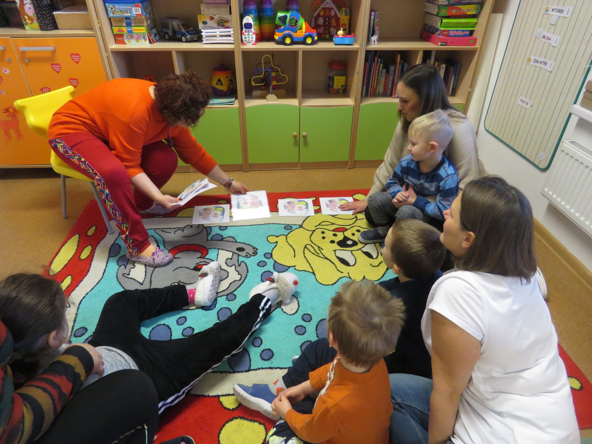 - Opowieść ruchowa „Podróż do krainy bałwanków”. Nauczycielka zaprosiła dzieci do kółeczka i zabrała w niezwykłą podróż. Przebieg opowieści ruchowej: „Zapraszam wszystkich do krainy bałwanków. W tej krainie jest bardzo zimno i trzeba się ciepło ubrać.