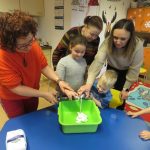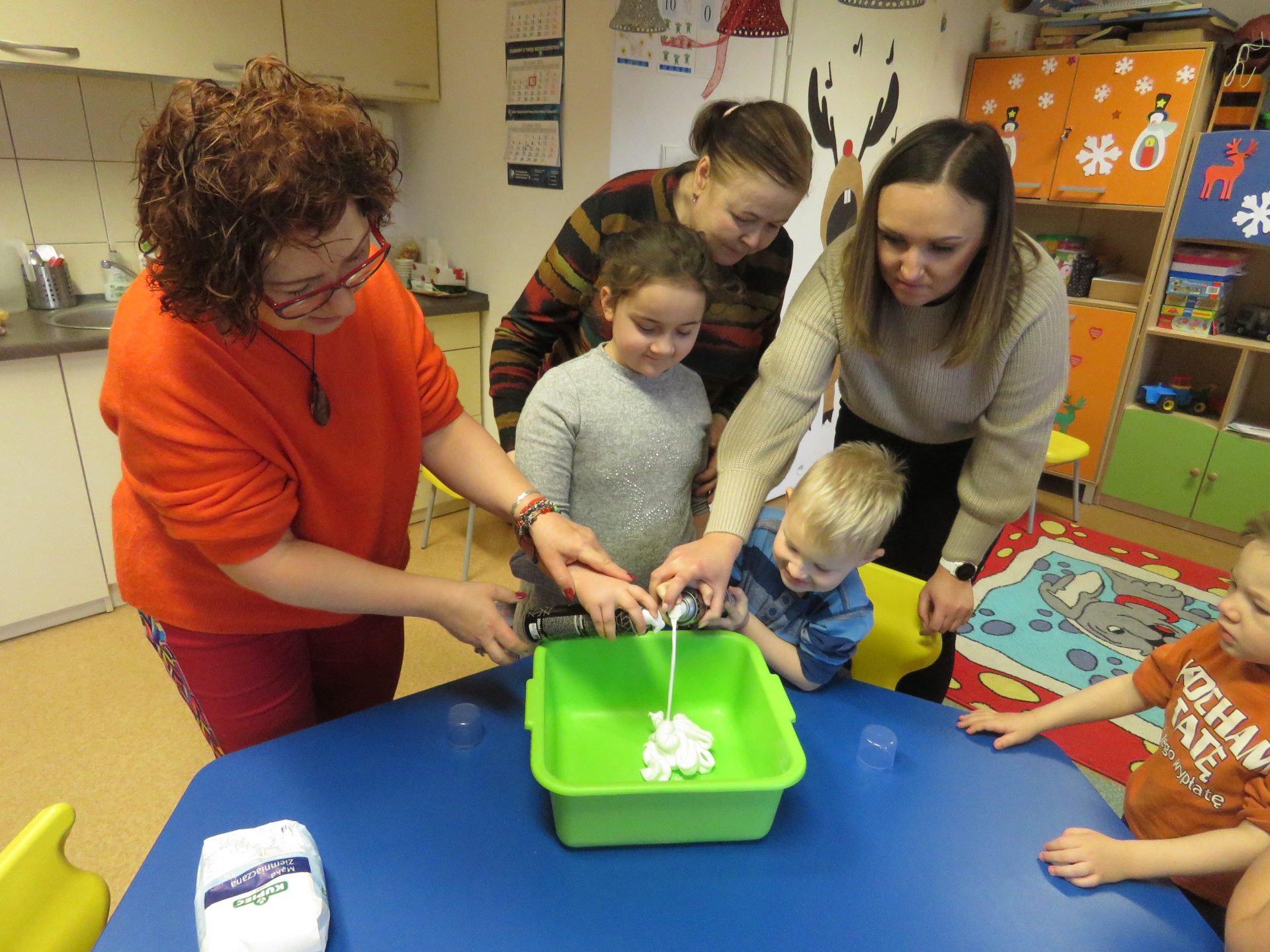 - Zabawa sensoryczna – sztuczny śnieg. Na ten etap zajęć chyba wszystkie dzieci czekały z wypiekami na twarzy. Razem z Panią uczestnicy spotkania stworzyli sztuczny śnieg z …mąki i pianki do golenia. Dzieci z nauczycielką wyrabiali rączkami sztuczny śnieg w z pianki do golenia i mąki ziemniaczanej. Lepili i ugniatali go według własnego pomysłu. Powstały kule śnieżne, potem bałwanki. Na koniec dzieci ozdabiały bałwanki i każdy miał kapelusz na głowie oraz kolorowe guziczki.