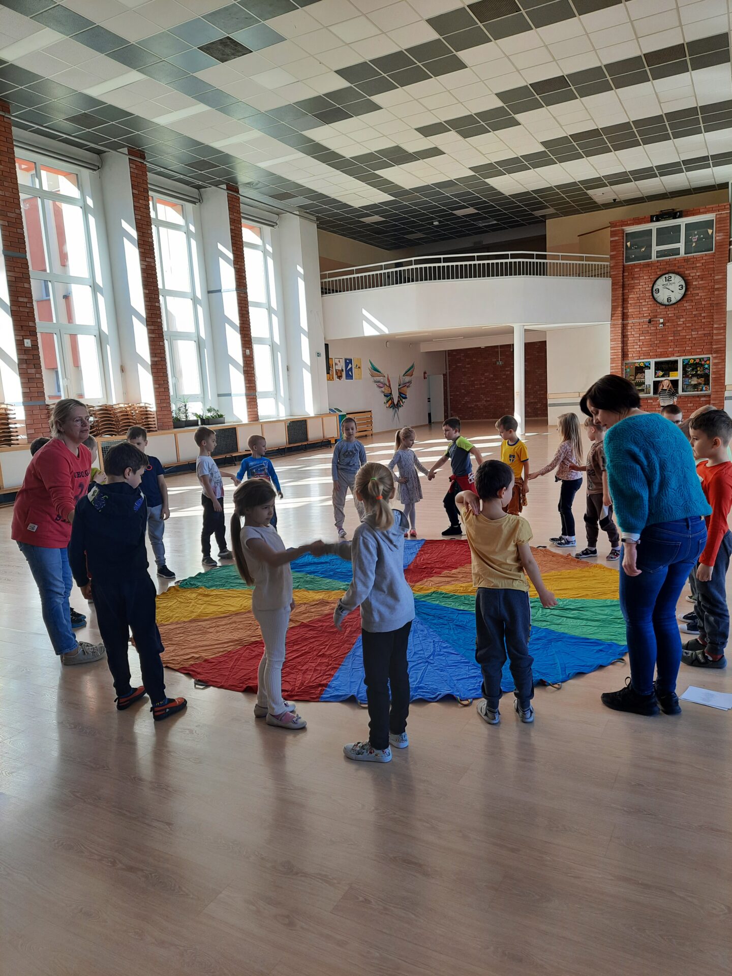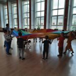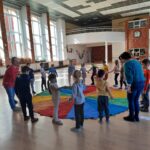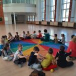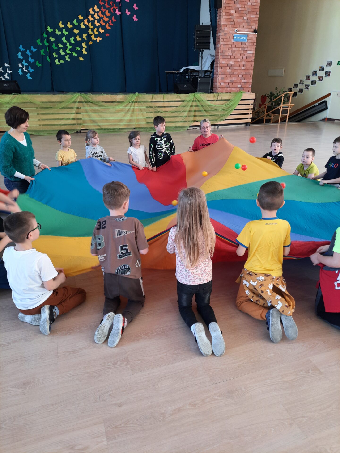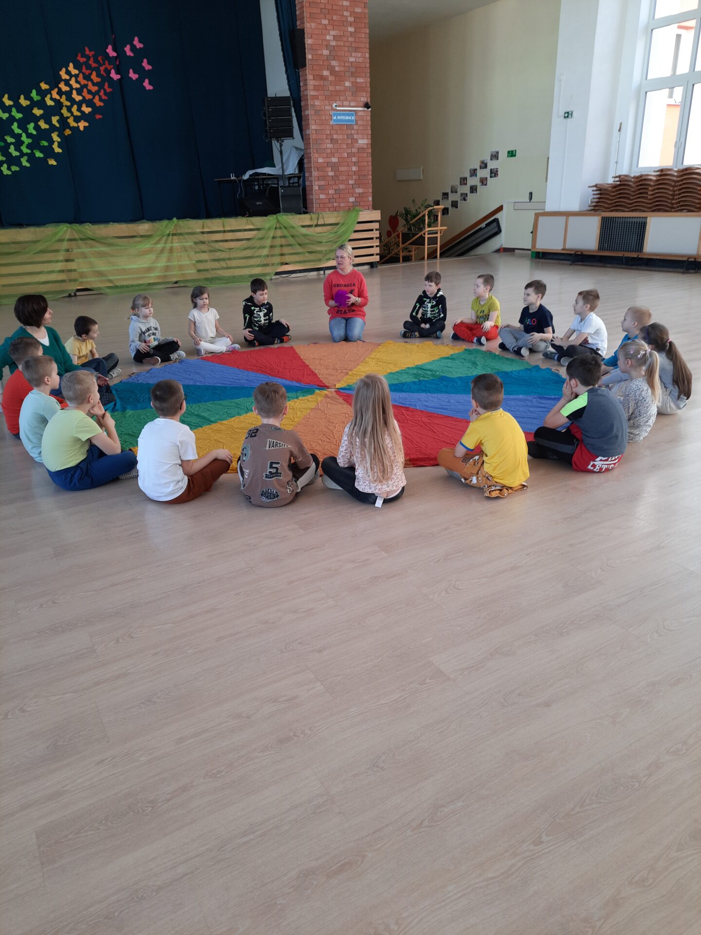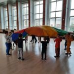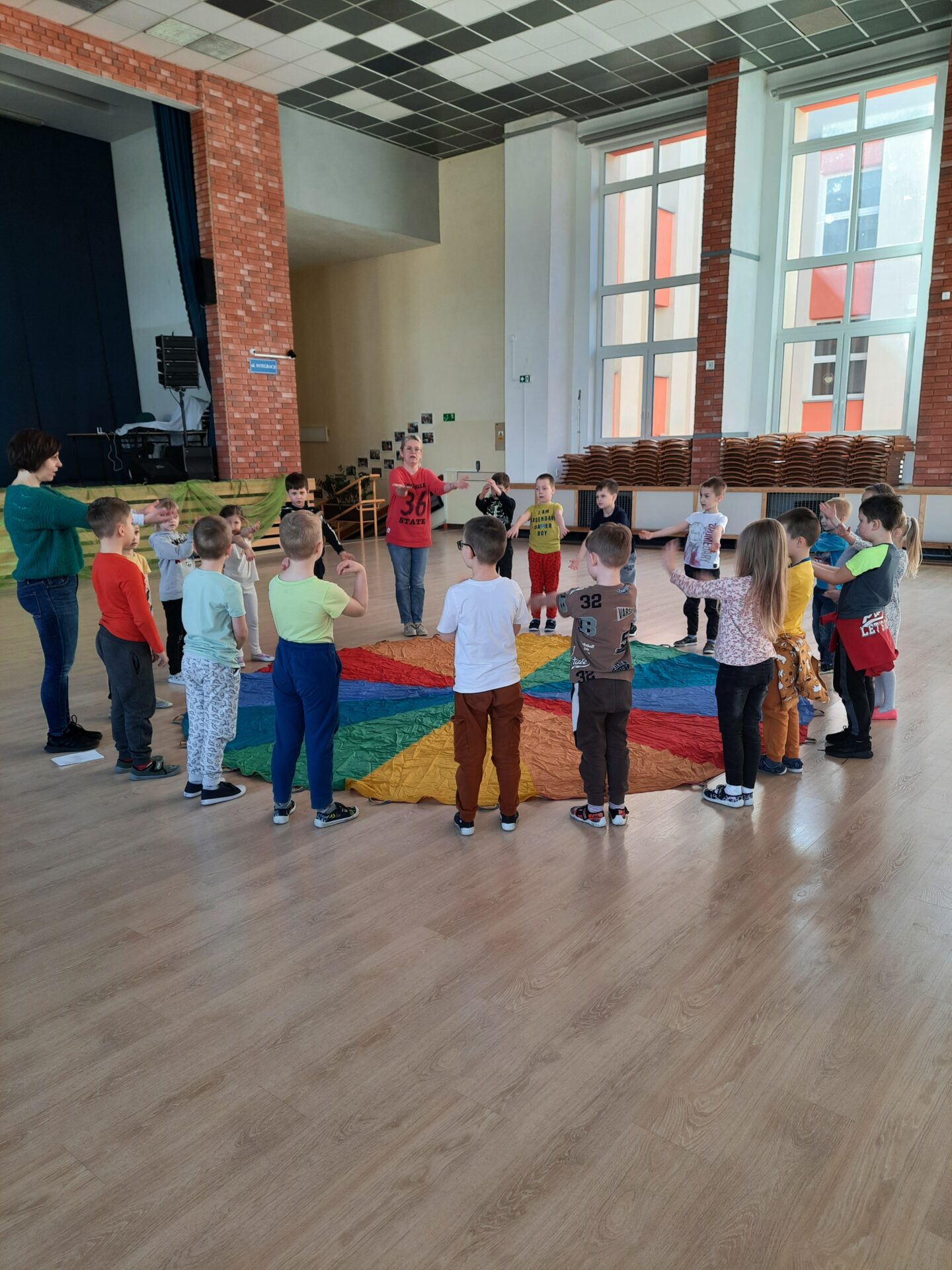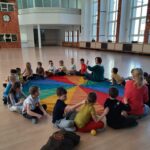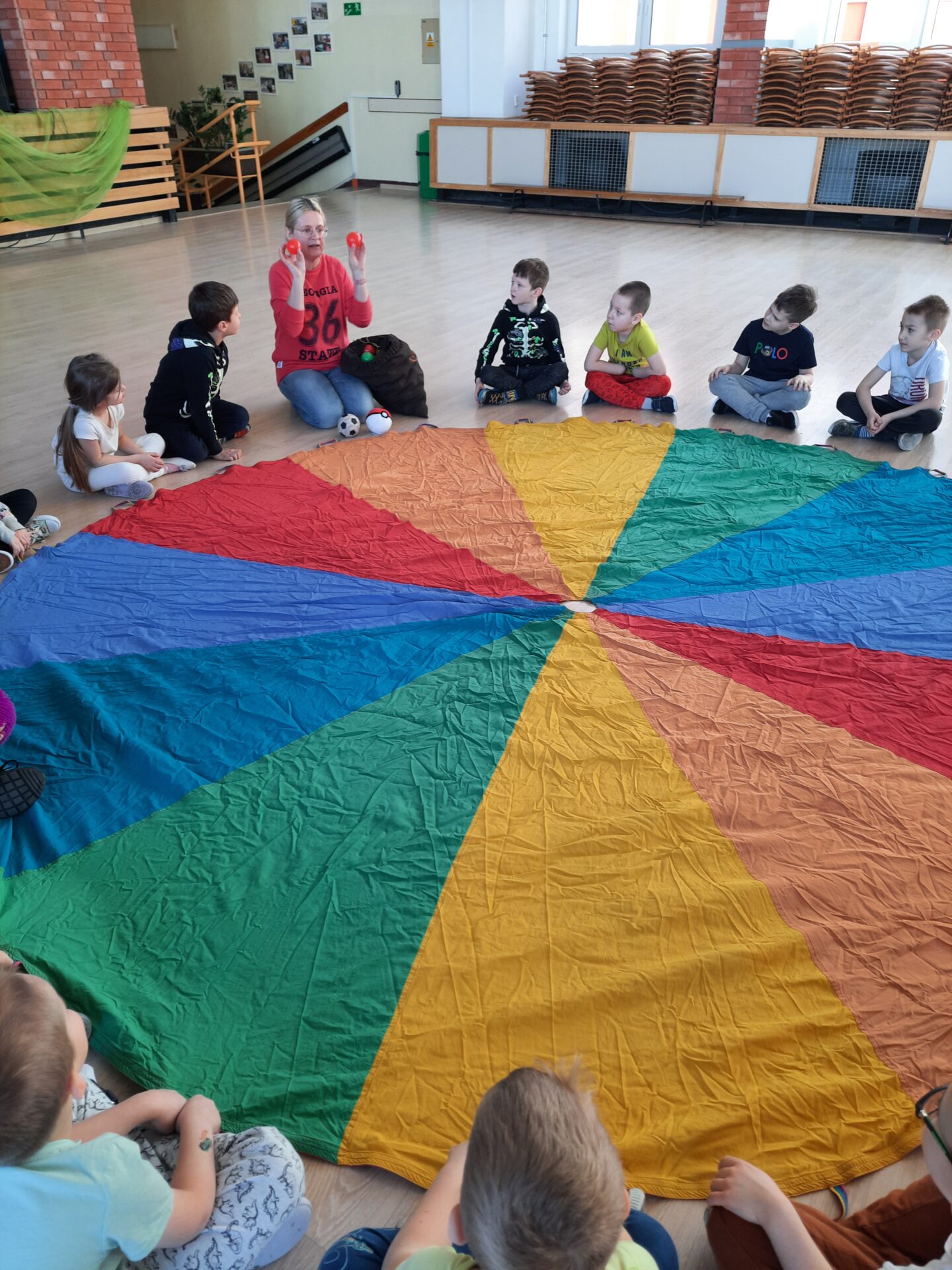 Elementem, który łączy wszystkie spotkania jest chusta animacyjna. Jest to duża wielobarwna chusta o kształcie koła, która sprawia, że dzieci fantastycznie się bawią, odkrywając coraz to nowe jej zastosowania podczas przeróżnych gier i zabaw zaproponowanych przez nauczycielki. Szczególnie ulubione to „Rybak i rybka”, „Naleśnik”, „Karuzela”, „Kurtyna”, „Bilard”, Prześlij przesyłkę”, „Podrzucanie piłki”, ‘Sałatka owocowa” , „Meksykańska fala” i mnóstwo innych…