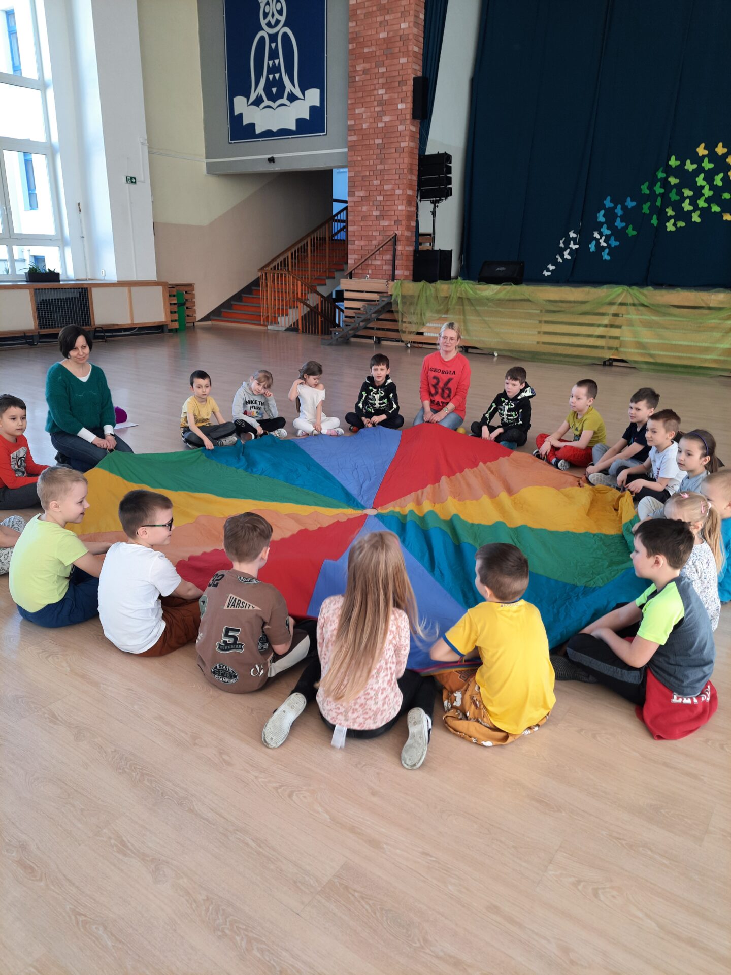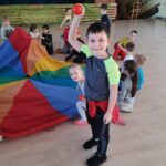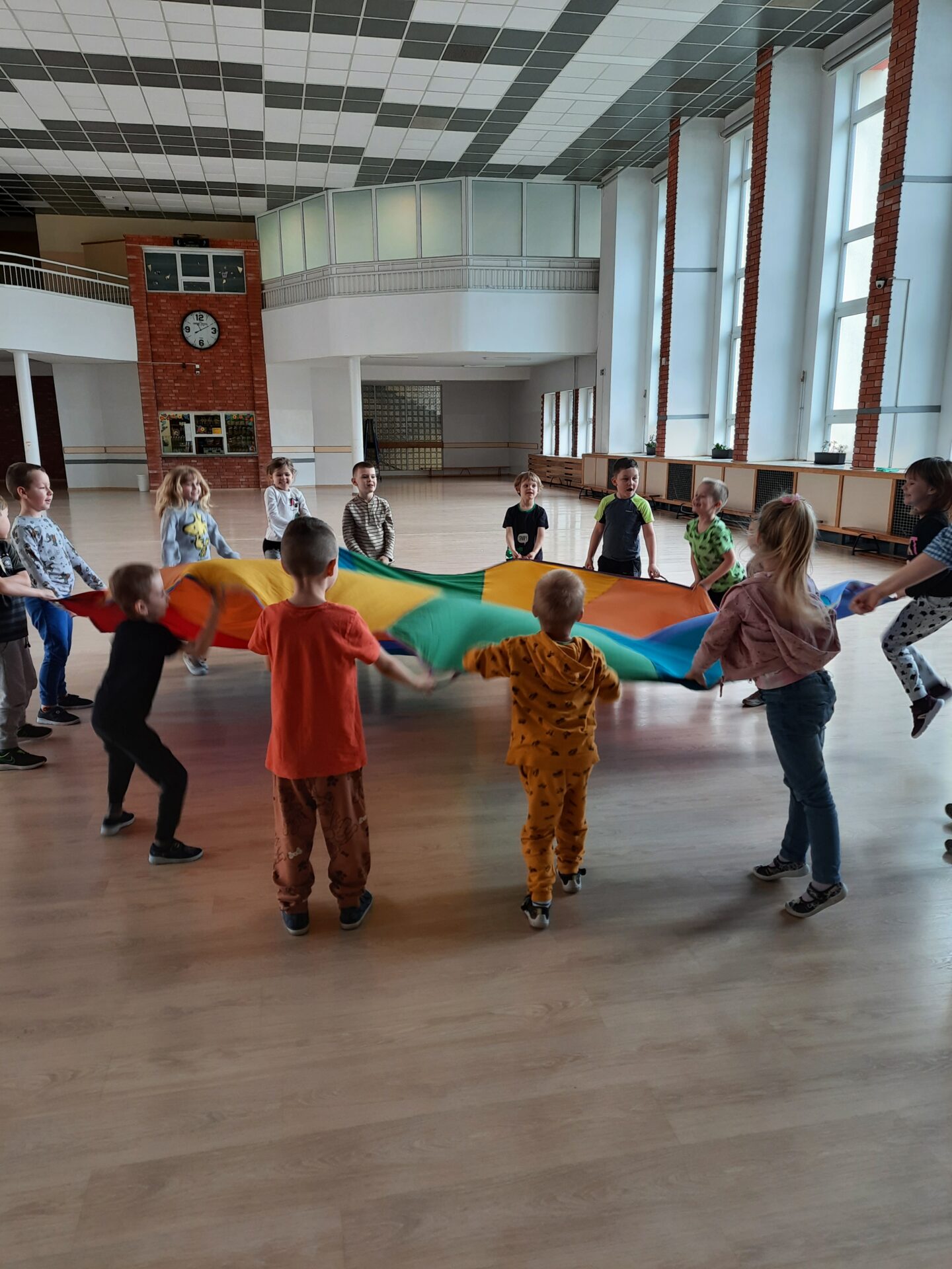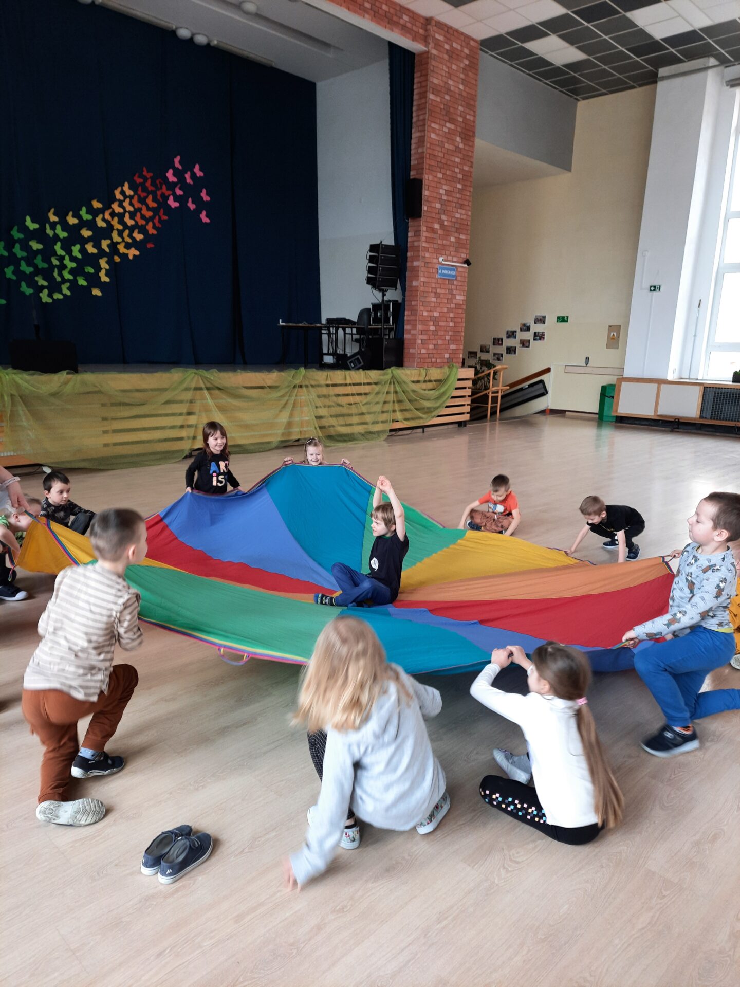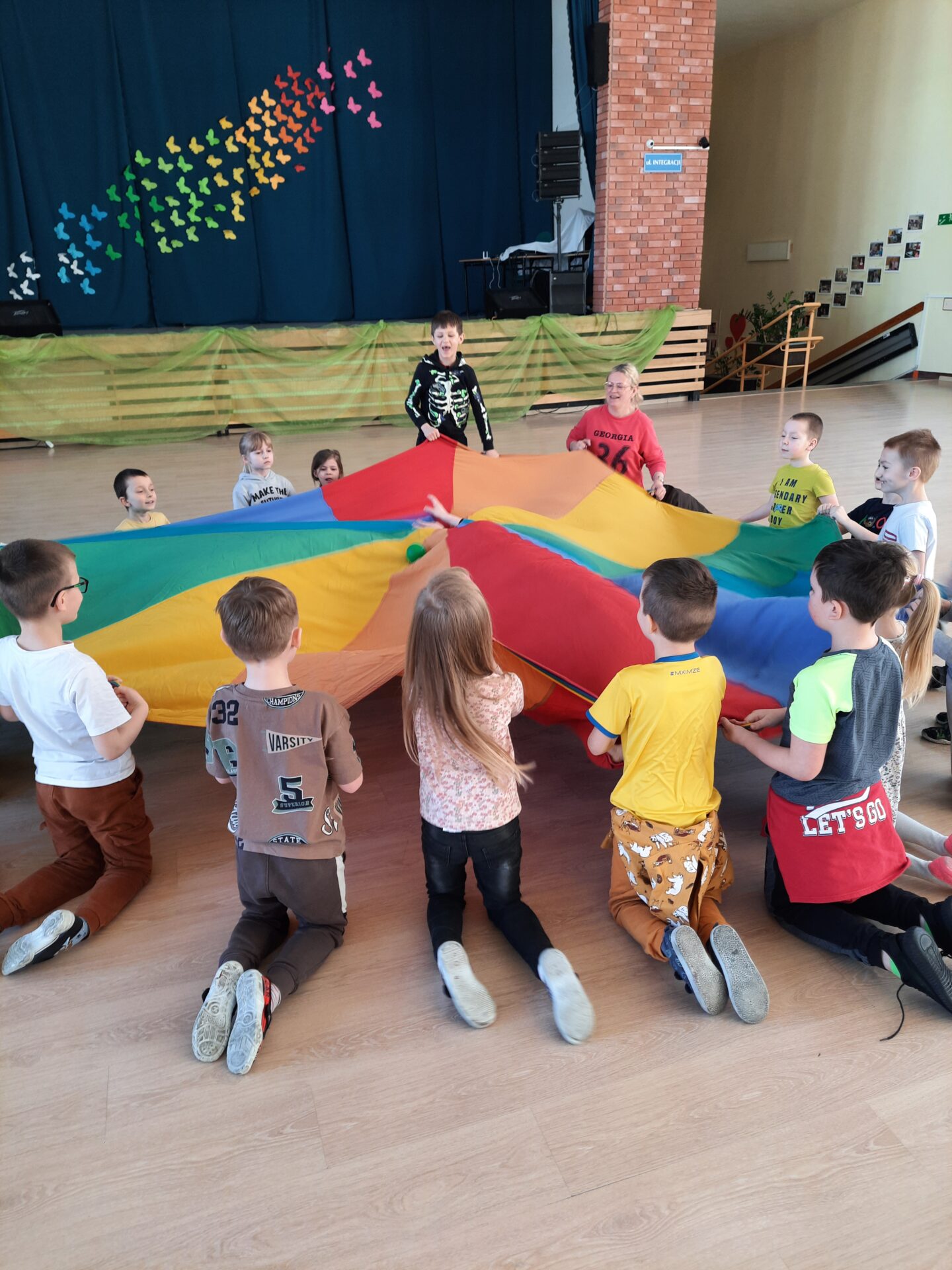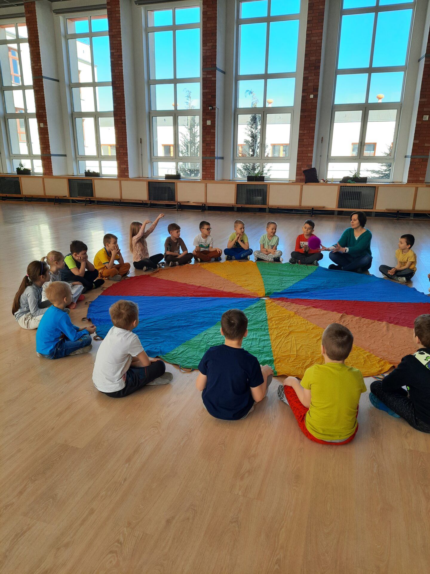 Elementem, który łączy wszystkie spotkania jest chusta animacyjna. Jest to duża wielobarwna chusta o kształcie koła, która sprawia, że dzieci fantastycznie się bawią, odkrywając coraz to nowe jej zastosowania podczas przeróżnych gier i zabaw zaproponowanych przez nauczycielki. Szczególnie ulubione to „Rybak i rybka”, „Naleśnik”, „Karuzela”, „Kurtyna”, „Bilard”, Prześlij przesyłkę”, „Podrzucanie piłki”, ‘Sałatka owocowa” , „Meksykańska fala” i mnóstwo innych…