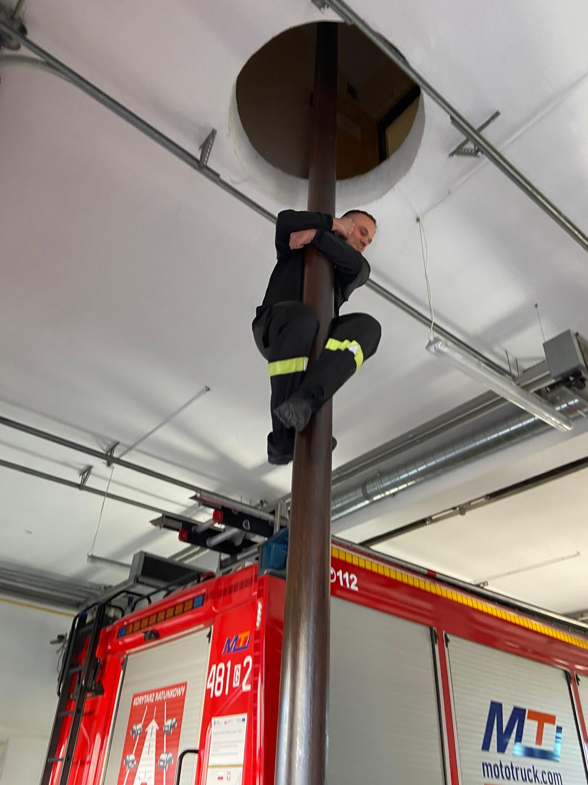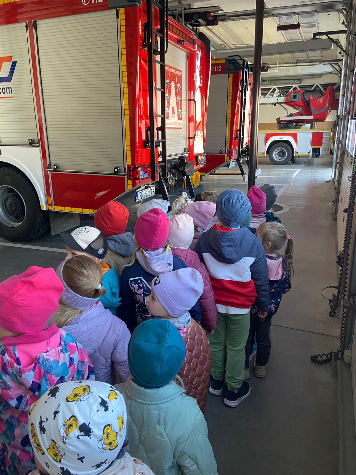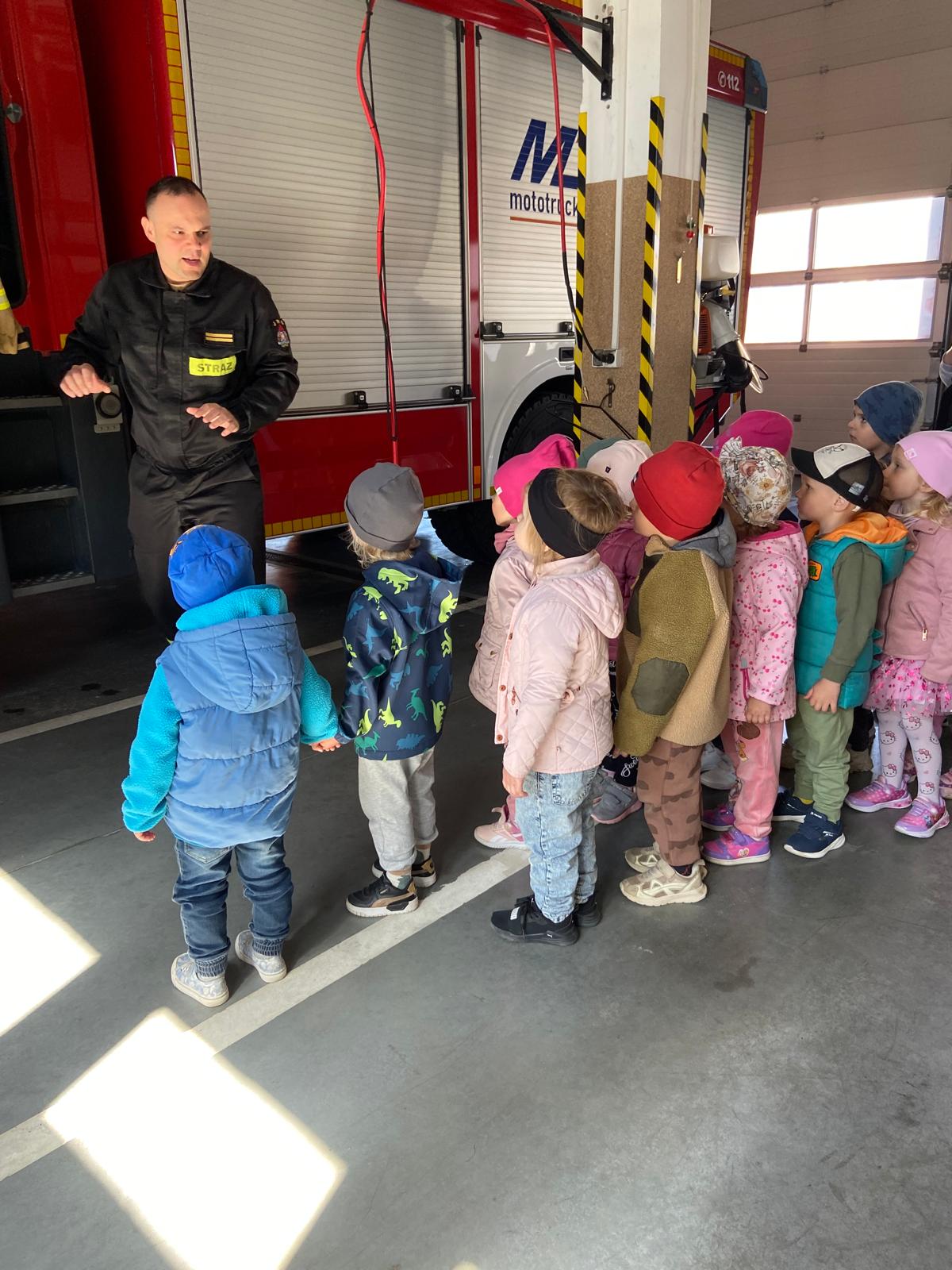 Bez wątpienia jednym z najbardziej ekscytujących momentów wycieczki był pokaz sprzętu i ubrań strażackich. Wielkie wrażenie wywarła na przedszkolakach możliwość obserwacji zjazdu strażaków do akcji po metalowej rurze.