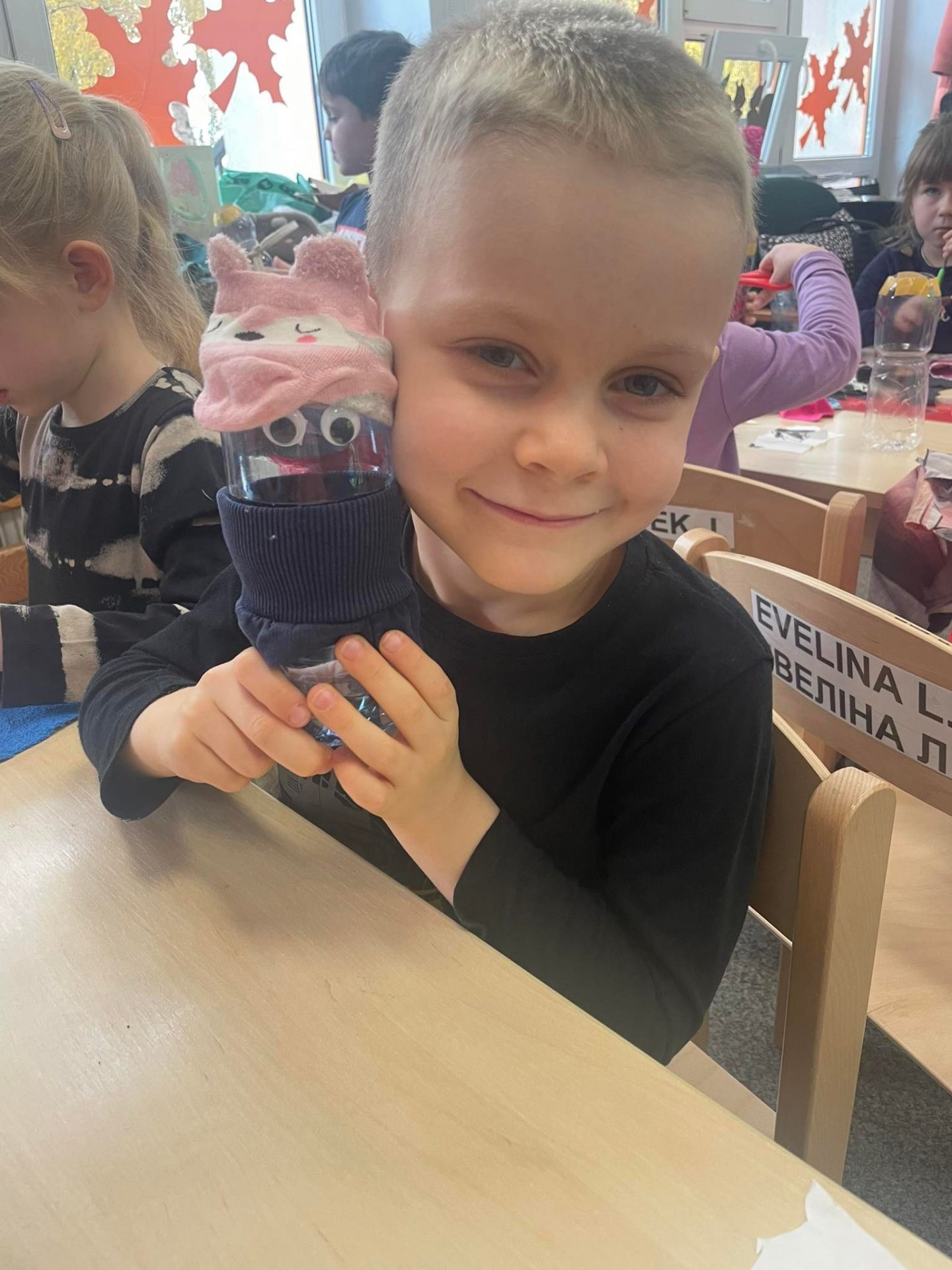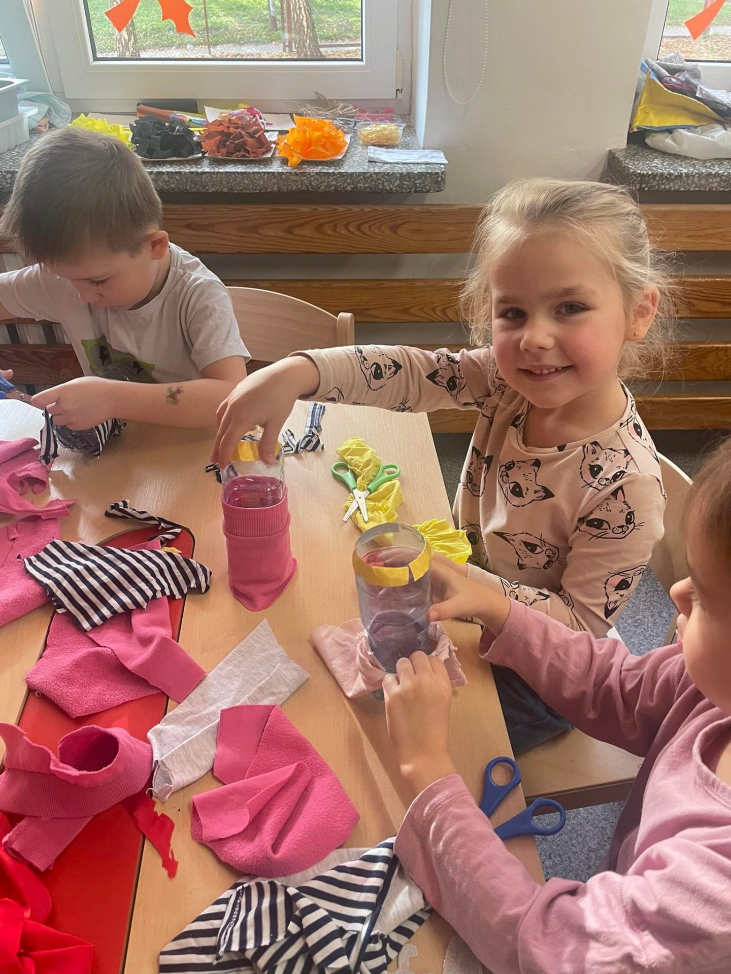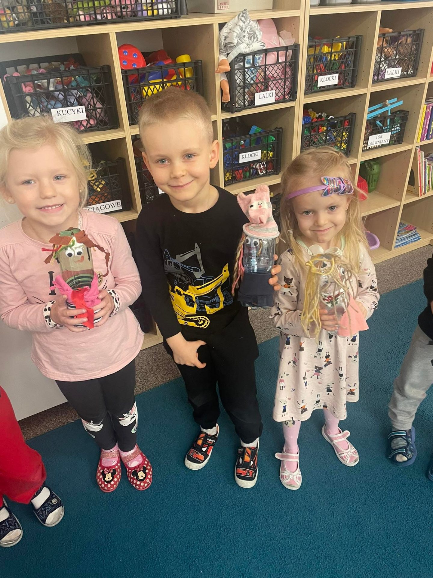Dzieci obejrzały również teatr cieni na tablicy multimedialnej i poznały baśń ludową „O rybaku i złotej rybce”. Na zakończenie cyklu zajęć „Słoneczniki” w ramach pracy technicznej wykonały samodzielnie przy wsparciu nauczycielki kukiełki teatralne z kawałków materiałów i przyniesionych przez siebie plastikowych butelek. Z radością projektowały swoje kukiełki, wykazując się przy tym olbrzymią kreatywnością i pomysłowością. Od tej pory eko-kukiełki będą służyły dzieciom w utworzonym w sali „kąciku teatralnym”. Zapraszamy do obejrzenia fotorelacji z przeprowadzonych zajęć.
