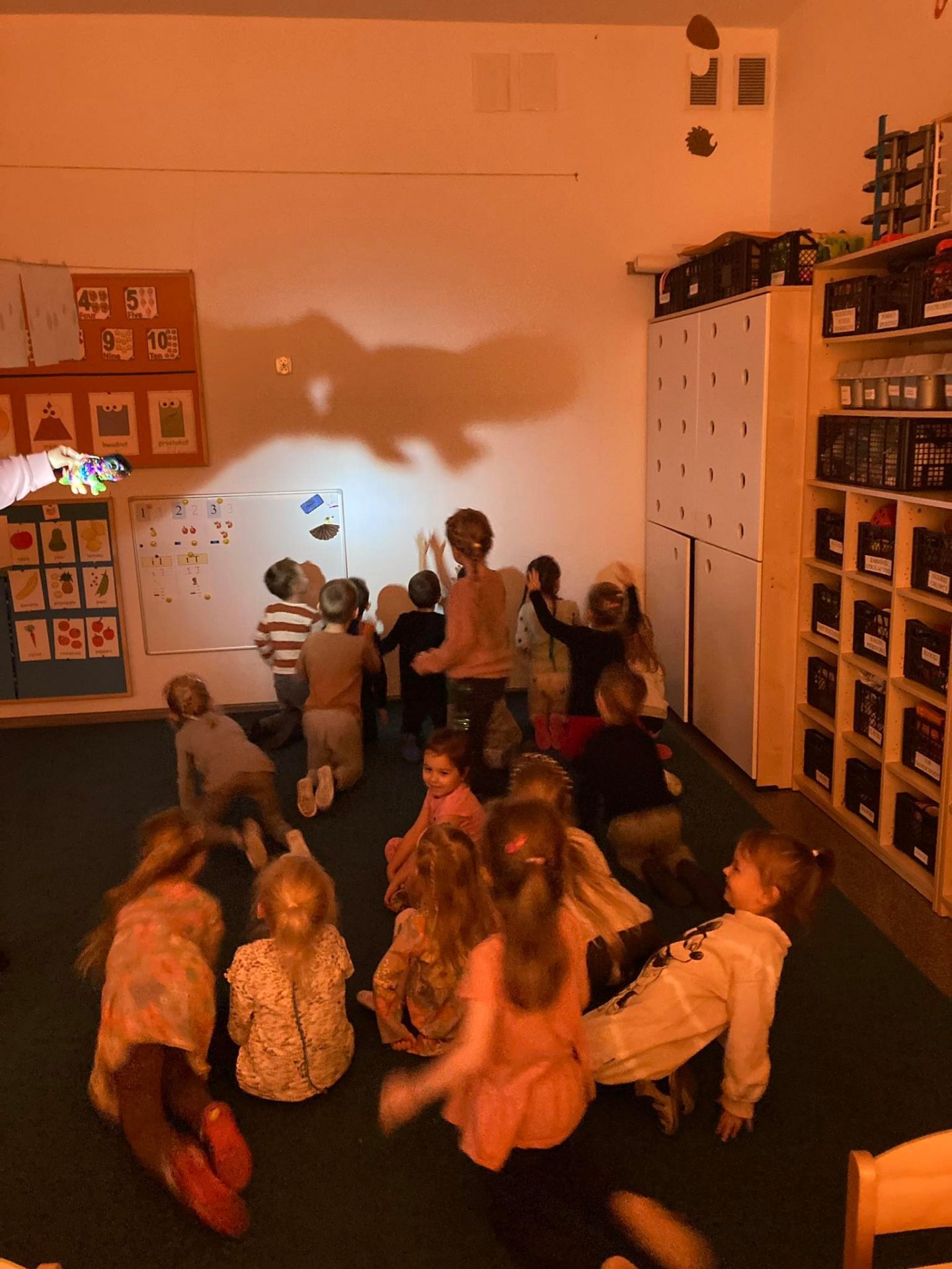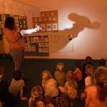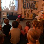 Przypomniały sobie również, że w teatrze niekiedy oglądać możemy różnorodne lalki – marionetki, jawajki, kukiełki lub pacynki, które pojawiając się na scenie, stają się aktorami. Pani Natalia wyjaśniła poprzez mały eksperyment, czym jest cień jako zjawisko, co wywołało u dzieci olbrzymi zachwyt. Przedszkolaki z radością dotykały cieni pojawiających się na ścianie. Eksperymentowały przybliżając i oddalając rekwizyty i źródło światła oraz wskazywały przedmioty, których cień chciałyby zobaczyć na ścianie.