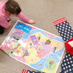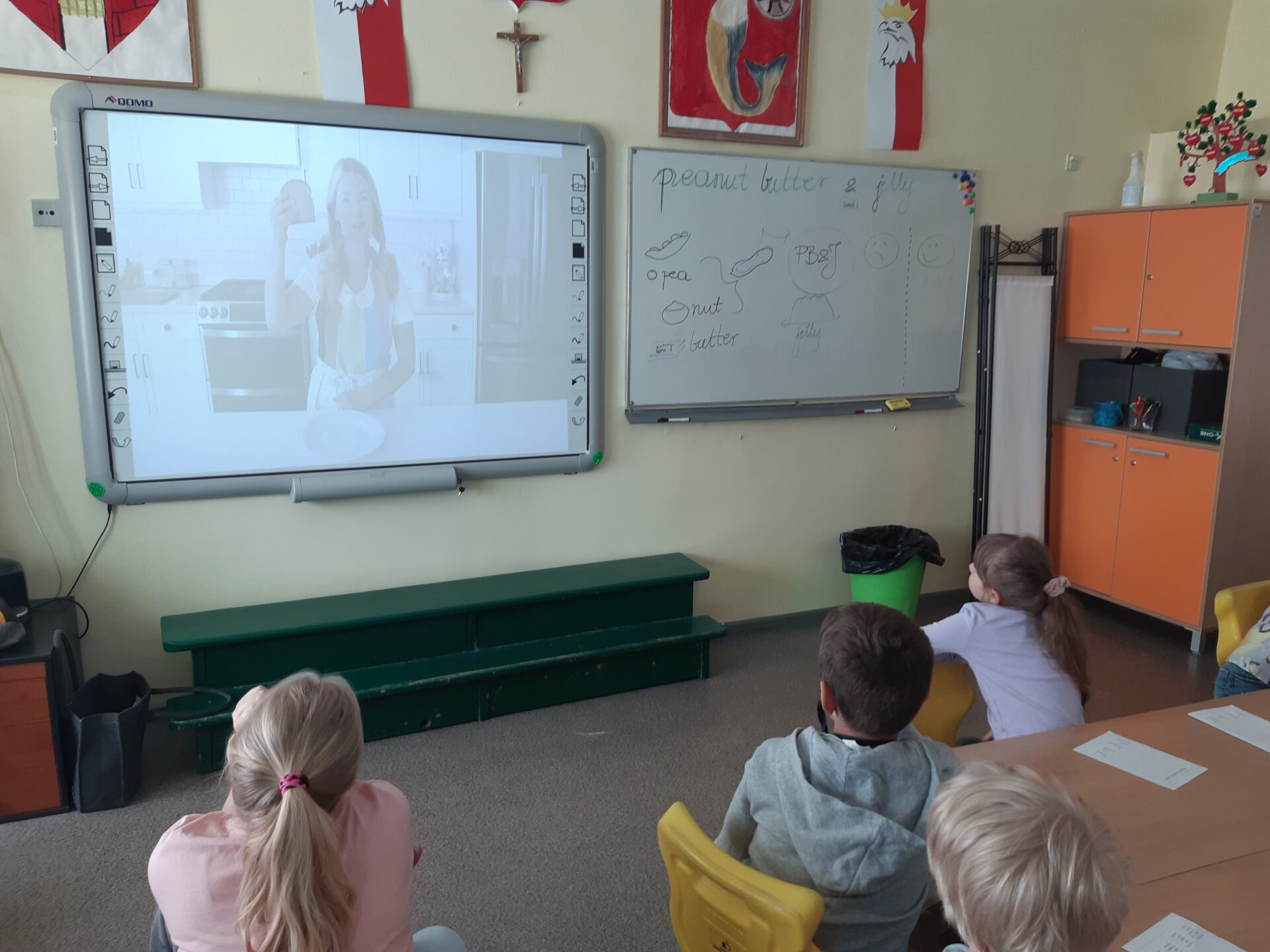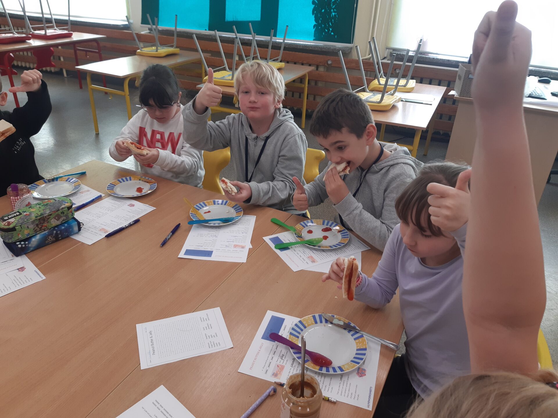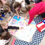 W swej wycieczce po globie, uczniowie klasy 2d dotarli do Stanów Zjednoczonych Ameryki Północnej. Poznali symbole narodowe USA, ich stolicę, dowiedzieli się ile pasków i gwiazd ma flaga amerykańska i dlaczego. Przygotowali i skosztowali najpopularniejszej wśród dzieci przekąski domowej – PB&J (peanut butter and jelly snadwich), czyli kanapki z masłem orzechowym i dżemem.